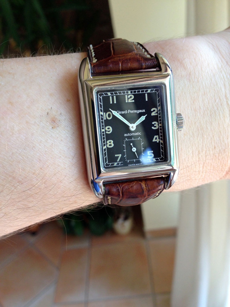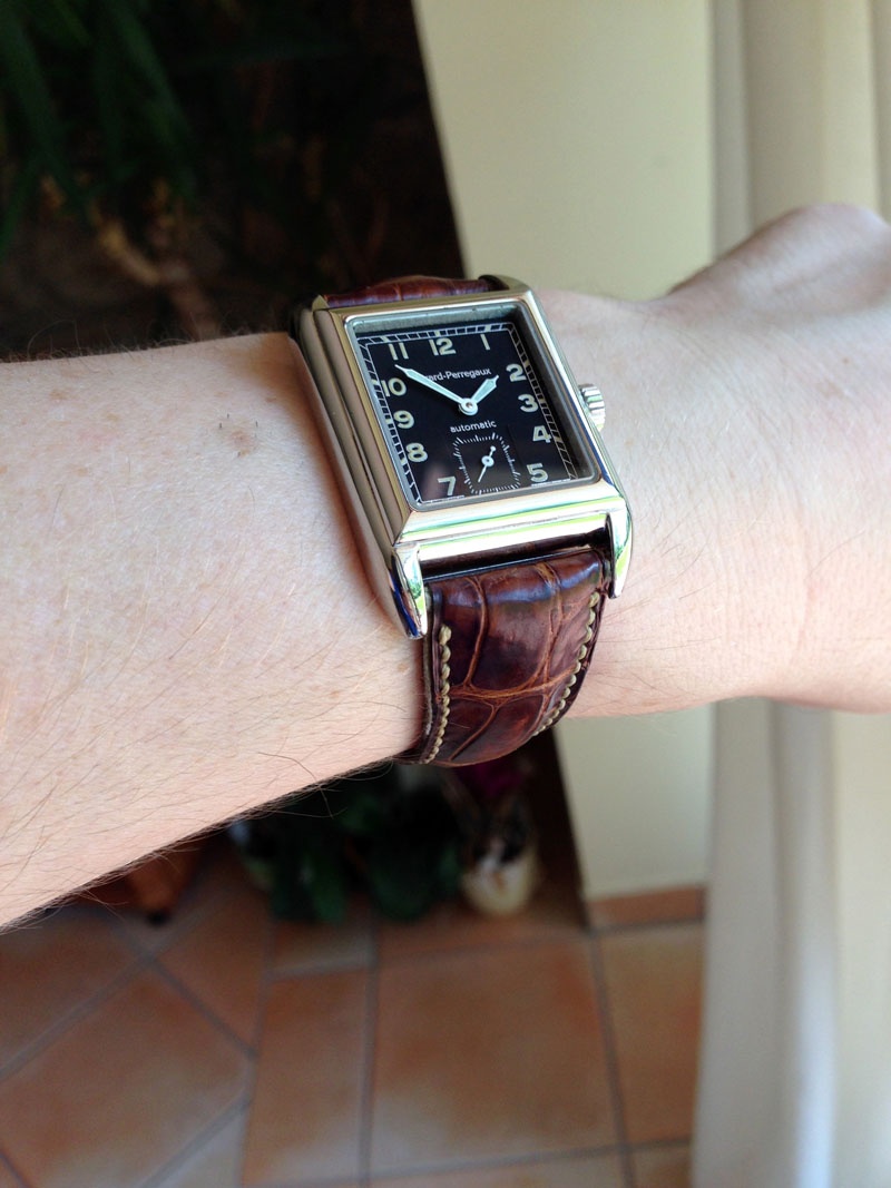 Now it has been almost 6 months with my watchmaker (who is a very busy men) but today I was happy to pick it up, now running smoothly. I put a GP brown strap with white stitching on it, not exactyl new but nice patina and a perfect match for the black dial.