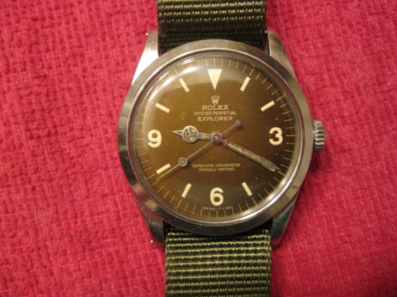 Hi, this is my first post concerning my first Rolex, I usually reside over at the Omega forum because thats what I prefer to collect. This watch might help to change my mind, it is a ca. 1961 1.5 mil, Explorer Ref. 1016. I happen to find this in a small upstate town in an equally small jewelry shop the other day when I inquired about vintage watches. I have never seen anything like this and I had been looking for a vintage Rolex but I was looking for a Submariner because I like the stainless sports models and they seemed readily available. The dial is the first thing that struck me and I suspected something was wrong with this because I expected a black dial, it finally dawned on me that it might have faded and maybe a Tropical. I liked it and the price was very resonable so I brought it home and started researching in past posts and the internet. First I would like an opinion as to what extent I should carry a restoration on this watch. The only detail that bothers me is the hands, I don't even like to polish the case unless I reaaly have to, the hands are kind of a mess but I don't want shiney new ones either, maybe a vintage set or refinish this set. Next I would like to address the missing Oyster bracelet, it came on a Speidel twistoflex, I couldn't find a reference# for it and any help would be greatly appreciated.