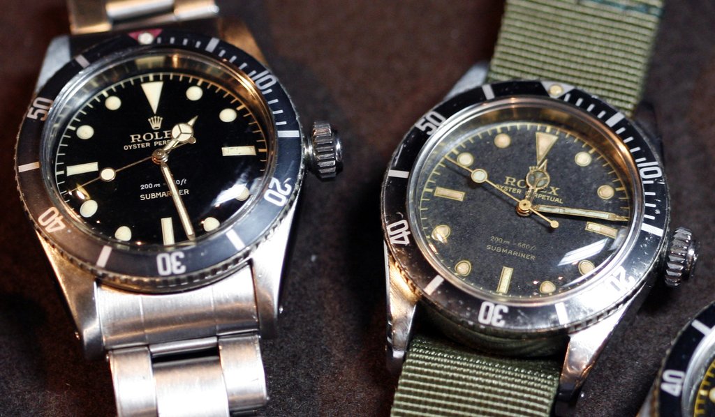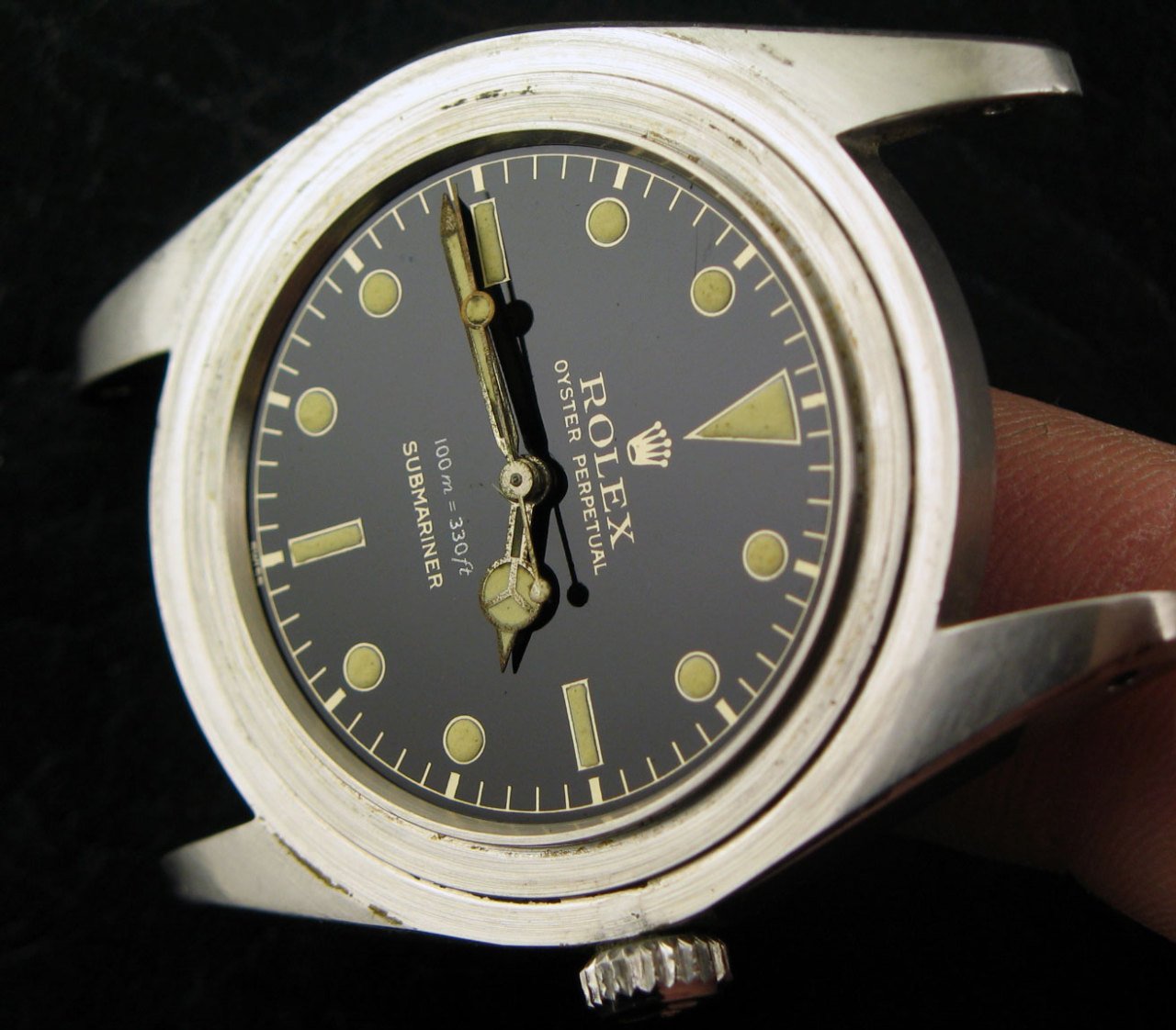 The story behind the 6536/1 with III-57 caseback and 306.xxx serial is that the owner read an article in the Dutch newspaper by Schaap & Citroen jewelers asking owners of submariner to come back and change it to a less active / radioactive dial version. There where a total of 9 around. This was in the Netherlands around 1960, i have the signed receipt of schaap & citroen...during changing the dial to a lower radiated now 2 colour gilt dial, he got changed the winding crown too, old one is on receipt....;- ) Now the 6536/1 has a gilt dial with silver dept as prior it was in all gold print. These old 1 colour printed dials had a 10 times higher radiation then the later 2 coloured gilt dials. Rolex was calling in their sub owners to change the dial as first reaction of the danger of radium. This later's a kind of mixed lume is still active under light and if one doesn't know this look one could point out a relume but it isn't. It's seen on dials from '59-'60. So theoraticly the 2 coloured gilt minutetrack dials are first service and later standard in production. Once we hit '62-'63 the radiations goes down by 5 times less Swiss T<25...