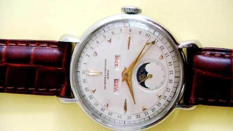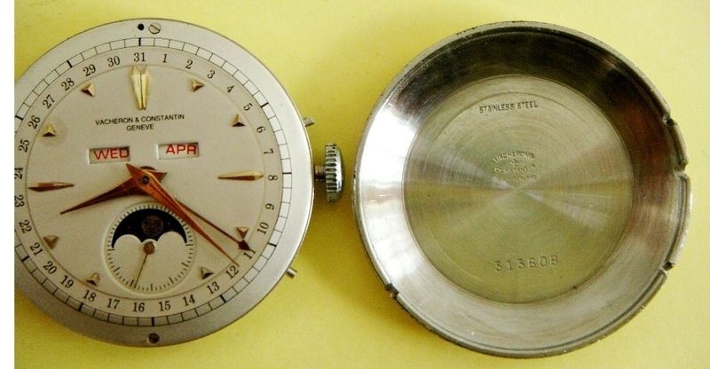 Gosh, the bids are approaching $3k for this fake calendar watch based upon LeCoultre parts. I "think" its trying to mimic the Ref. 4240 full calendar which came in gold and stainless steel (and combination of gold/steel) with and without moon phases, however the case serial numbers for the steel models were of the 273xxx series and the case shape was different, with nice fluted sides. Also the proper calendar moon phases movement would have been the calibre 485/495 family, while this isn't even the 454/5B its pretending to be. Its shocking to think that people have good money to throw at fakes!