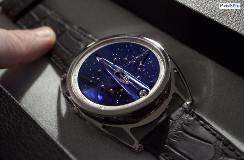 Probably the most spectacular and discussed novelty shown was the DB28 Skybridge. As a member of the DB 28 Collection it has their familiar case and the movement (caliber DB 2105; hand-wound, 6 days power reserve) is not new as well. So why is it spectacular for so many people? Well, because of the mesmerizing blued mirror polished dial with the skybridge and the white gold and diamond stars. Some may say we have seen something similar before (Only Watch 2011). That is true, but “the style” of the latest one is stronger than ever before and it feels like you can get lost looking at the dial only.