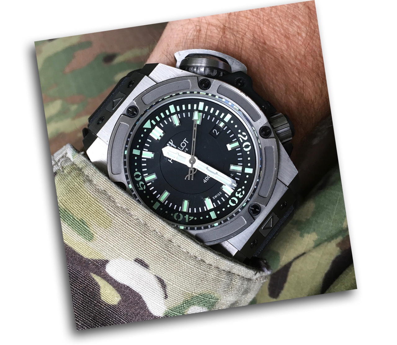 We hear a lot about "military watches," but after 33 years in uniform, I'm still not sure what that means. There is no "standard issue" watch in the U.S. military (that I'm aware of) and if there were, I'd probably still be inclined to go off the beaten path. In this case, with my Hublot Oceanographic 4000. It looks and feels heavy duty, and I fear not climbing in and out of armored vehicles or aircraft as I'm more concerned about damaging the vehicles than my watch ; ) Sure, It's acquired a few minor nick and dings, but they're come about honestly and I wear them as battle scars.