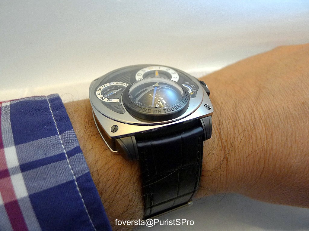 In my point of view, HDT4, whose press release was issued a few days ago, denotes a slight change if we compare it with the 3 previous pieces of the collection. Even if it contains the characteristics listed before, I think it is the most comfortable and easiest watch to wear of the quatuor. Moreover, the daring design of the first 3 of the series had a tendency to be too eye-catching and so to reduce the visual impact of the Tourbillons by themselves. This time, there is no risk: the whole design is dedicated to highlight the main point of interest: the Tourbillon and it is not a mere one!