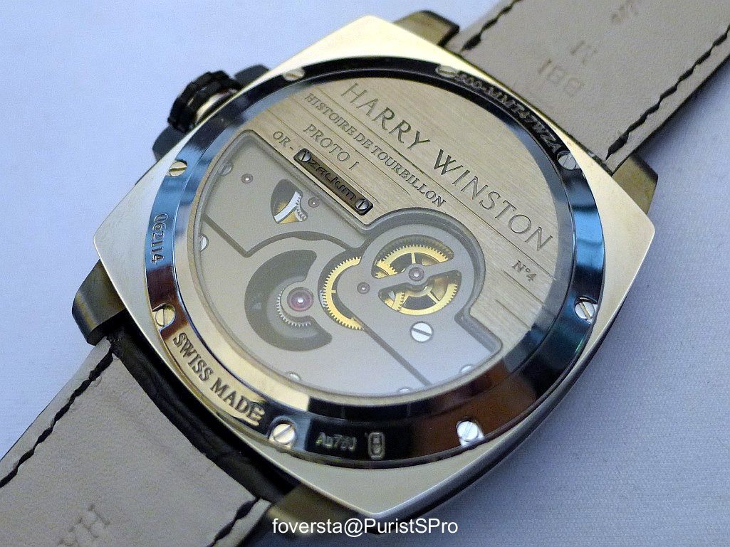 It is not the first time we see a tri-axial Tourbillon in a wristwatch. Thomas Prescher presented his Triple Axis Tourbillon several years ago. But the speed of the last "dimension" was slower because the third axis was doing a full revolution in one hour. Prescher's Tourbillon was a flying one in order to make it as enjoyable as possible. Harry Winston took another option: the speed is increased (by 12 times for the outer carriage) and the Tourbillon is "more protected" by the carriage pillars. What we lose in terms of availability for the view, we earn it in terms of speed.