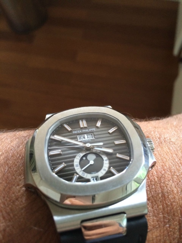 This gray dial has fantastic reflections under light and goes to very light to dark grey and always changes. His relative thickness (> 11 mm) compared to the 5711 makes you feel that you have a watch at the wrist, without being too heavy.
