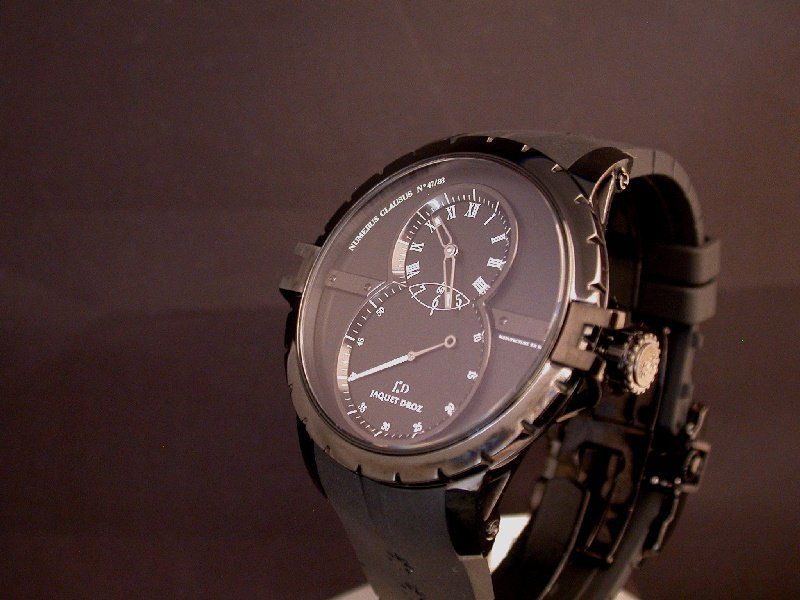 Of late I've been quite attracted to the darker watches. I recently reveiwed Vacheron Constantin's Quai de l'Ile in titanium on the VC forum. I've grown to appreciate Bell & Ross's creations, especially those with the carbon finish. And now I've seen the Jaquet Droz Grande Seconde Sport Watch Noir and I like it more than the standard SW. It is limited to 88 watches.