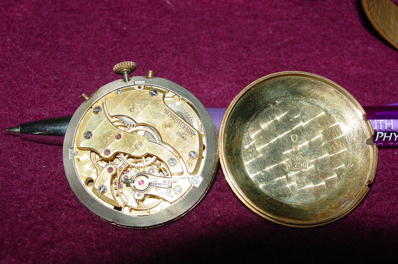 I own a JLC 18K Triple Date watch and would like to get some idea as to the manufacturer's name of the watch, the approx. date made and the approx. value. The rear cover shows a #461 07 with an "A" centered beneath. The movement inside shows a #510896. In my photo, the hands look dark, but they are also gold (just a bad photo). Thanks for any help at all.