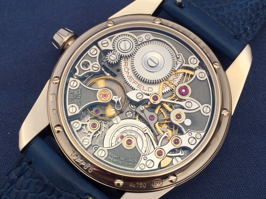 Grönefeld 1941 Remontoire is my favorite watch of the Fair! Everything seems to be consistent and at the right place. Even the idea behind the watch: the 8 seconds constant force system which is visible on the dial side.