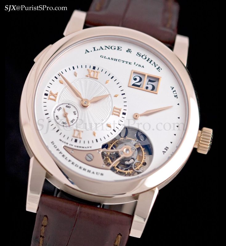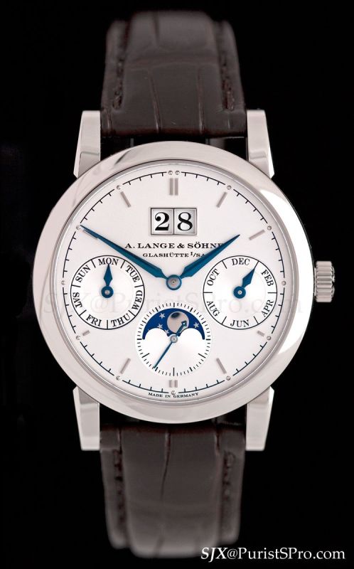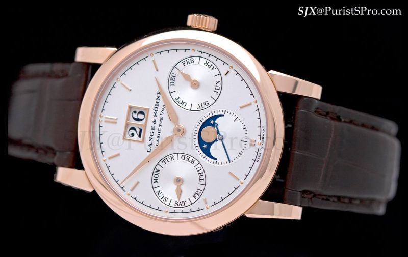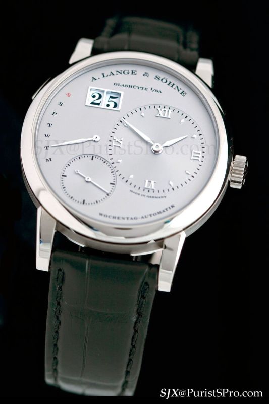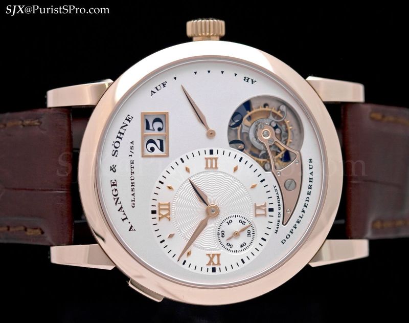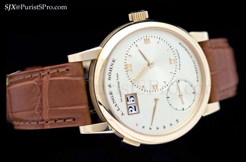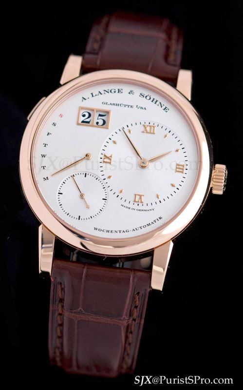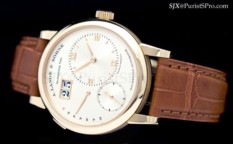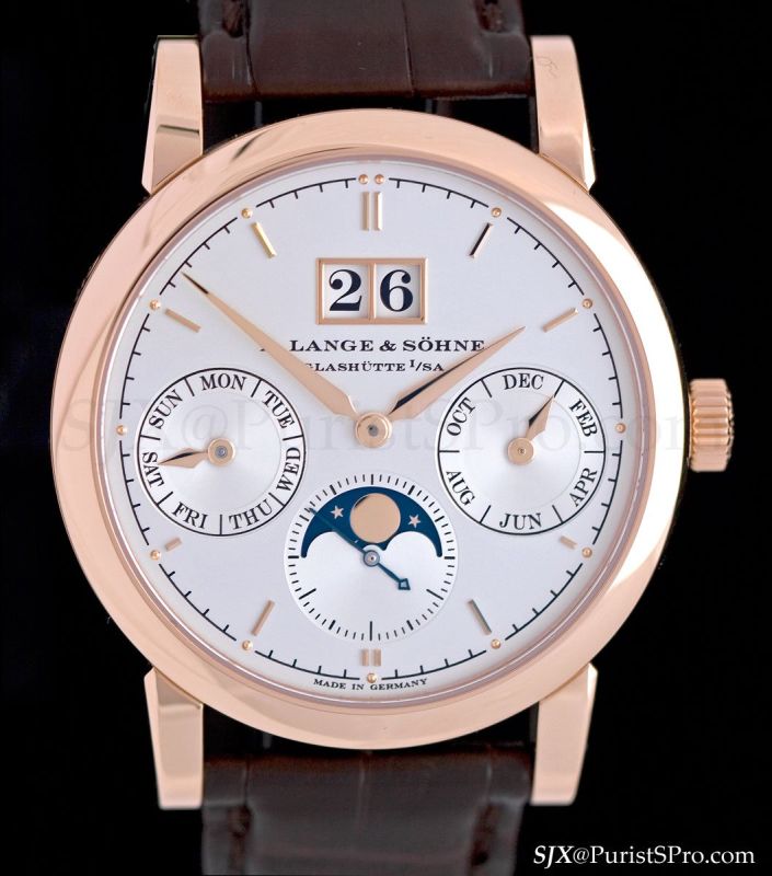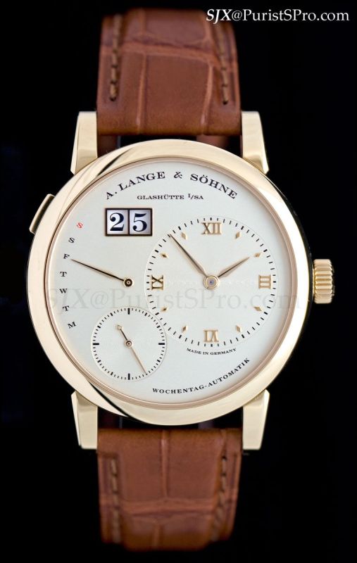 Available in yellow or rose gold, or platinum, this watch is a visual mirror image of the original Lange 1. Though it is marginally larger than the original at 39.5 mm in diameter, that increase is almost imperceptible without a side by side comparison. It displays day and date, probably making it the most practical watch in the whole Lange line-up.