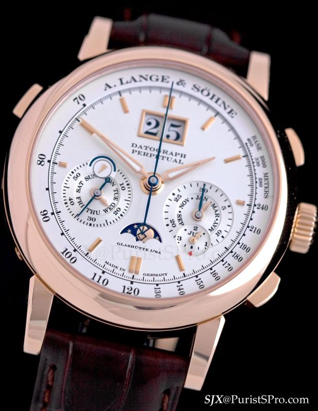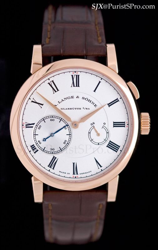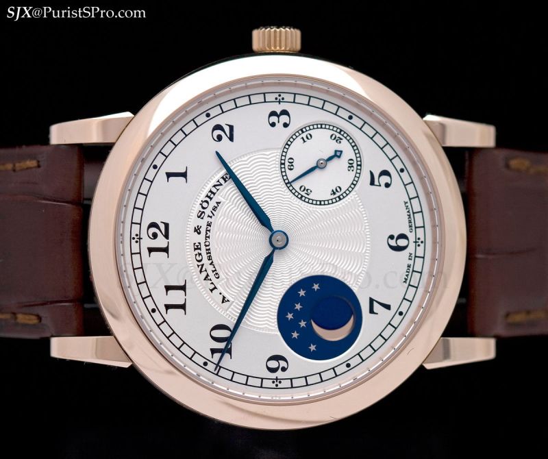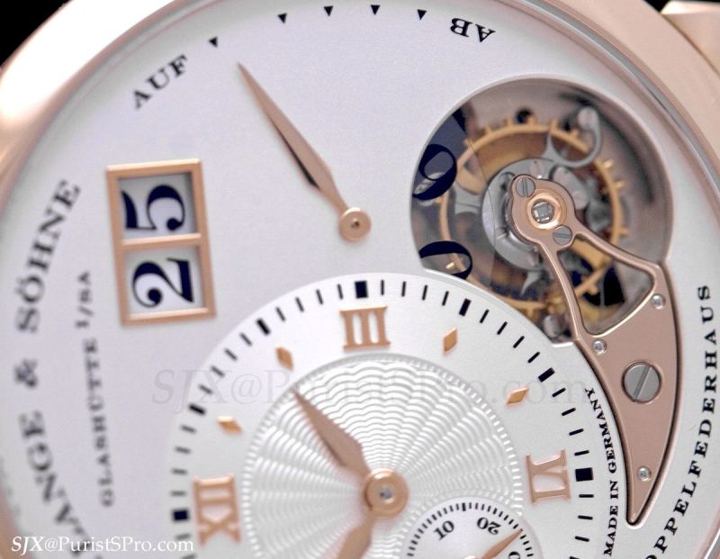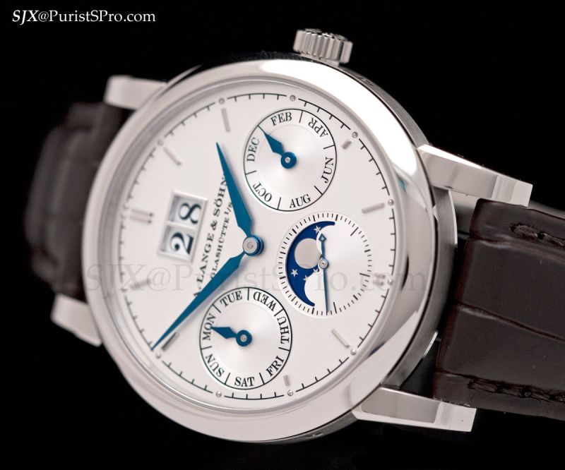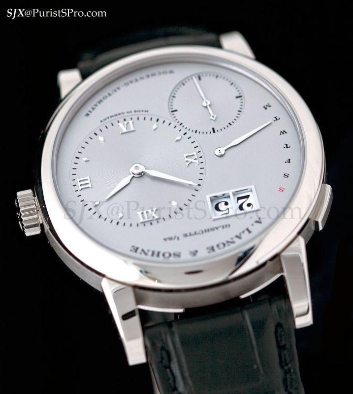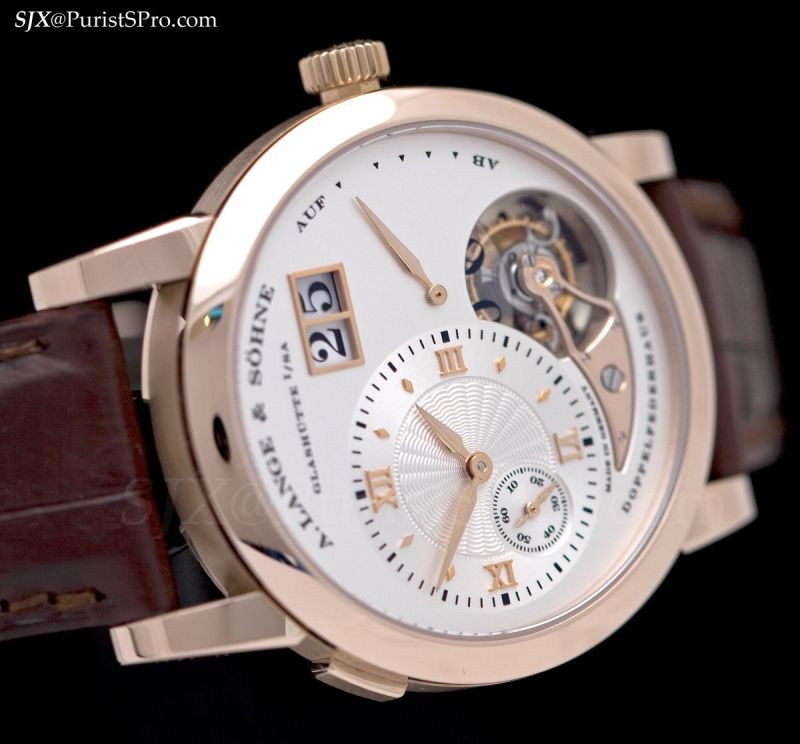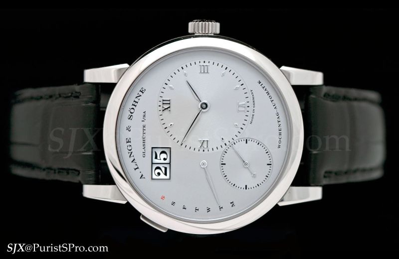 Available in yellow or rose gold, or platinum, this watch is a visual mirror image of the original Lange 1. Though it is marginally larger than the original at 39.5 mm in diameter, that increase is almost imperceptible without a side by side comparison. It displays day and date, probably making it the most practical watch in the whole Lange line-up.