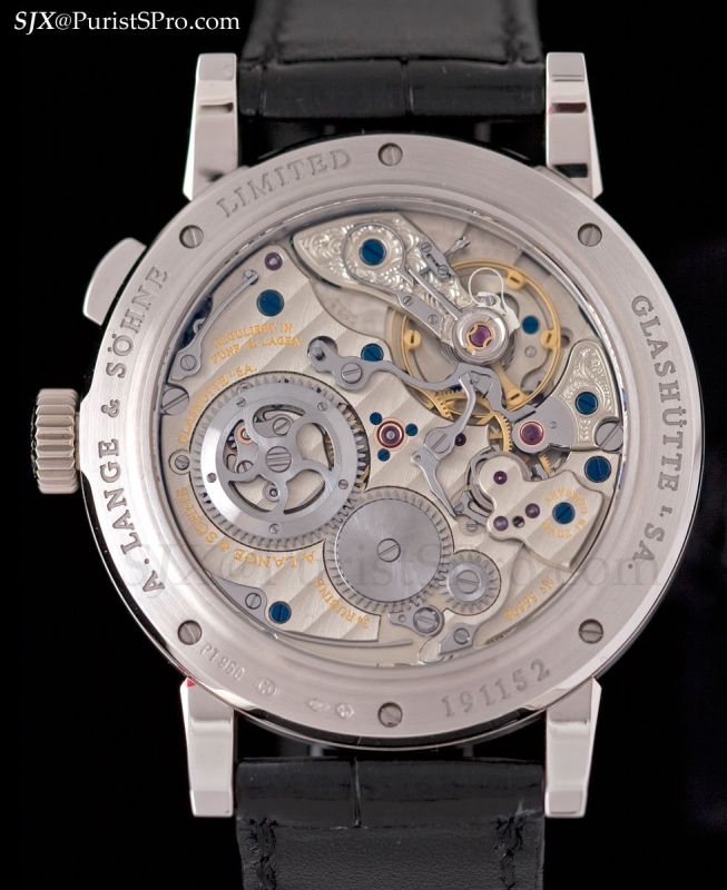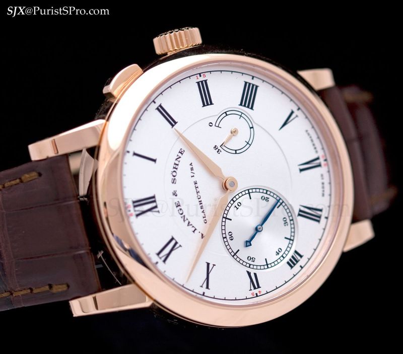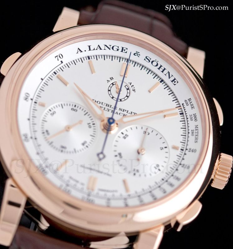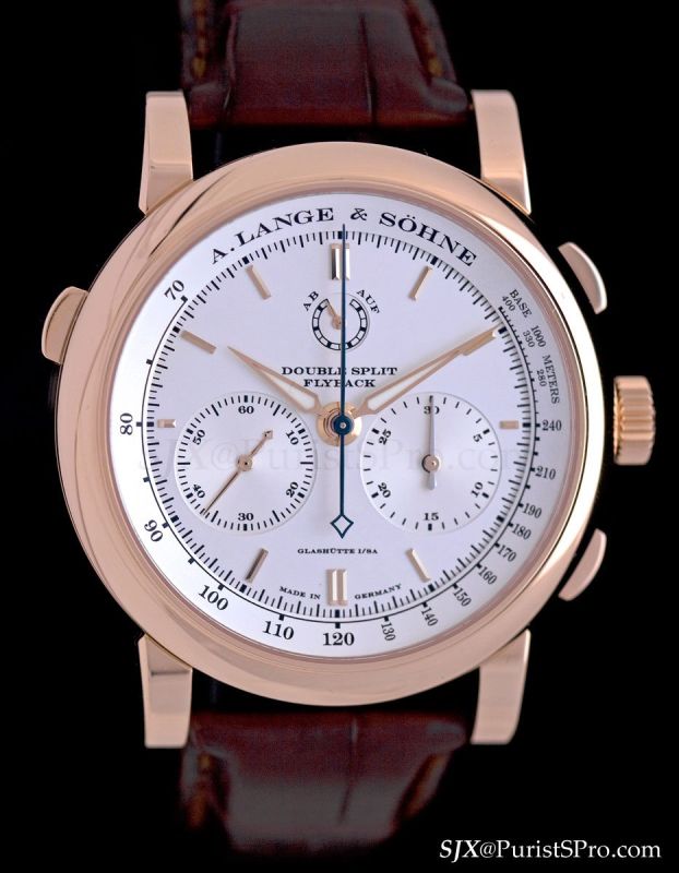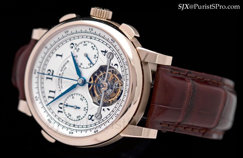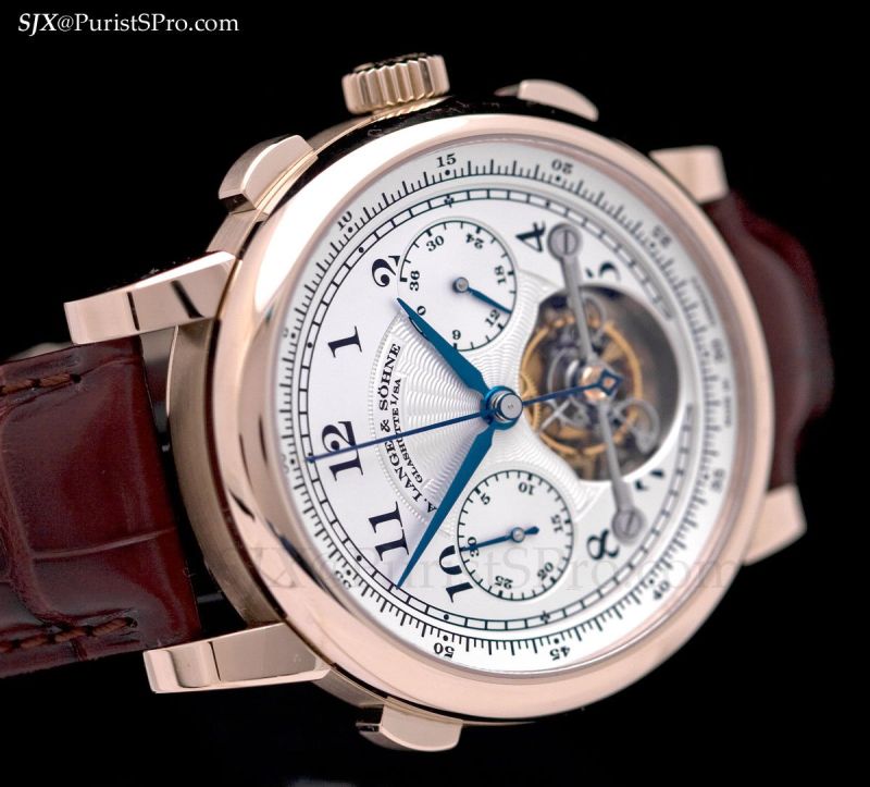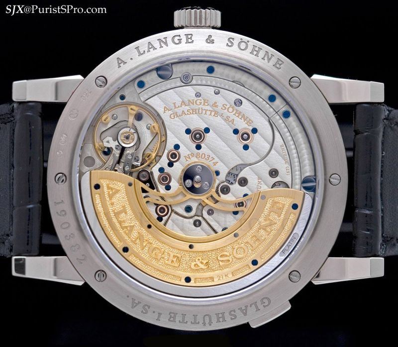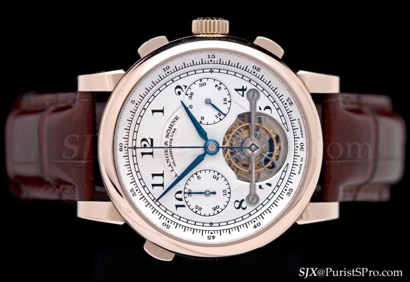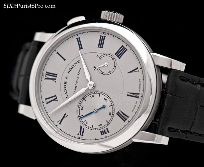 Available in yellow or rose gold, or platinum, this watch is a visual mirror image of the original Lange 1. Though it is marginally larger than the original at 39.5 mm in diameter, that increase is almost imperceptible without a side by side comparison. It displays day and date, probably making it the most practical watch in the whole Lange line-up.