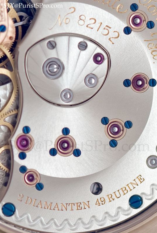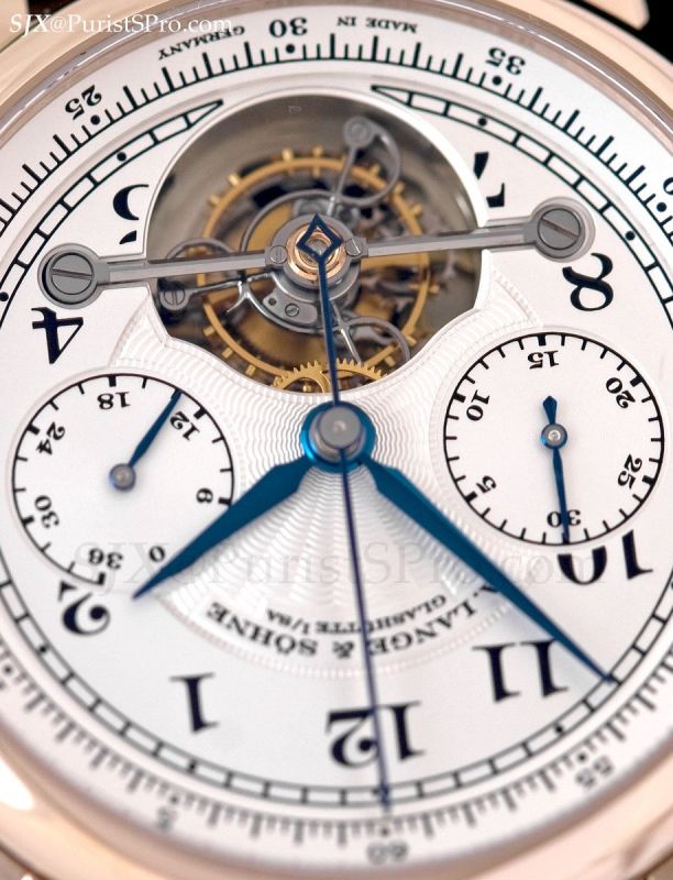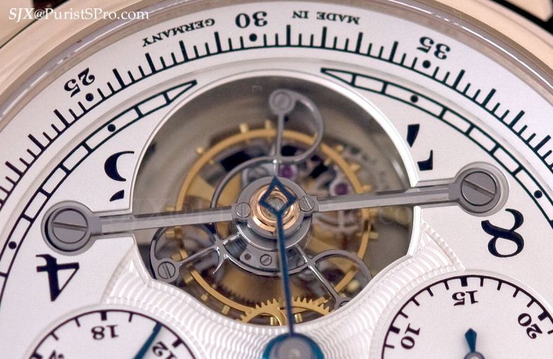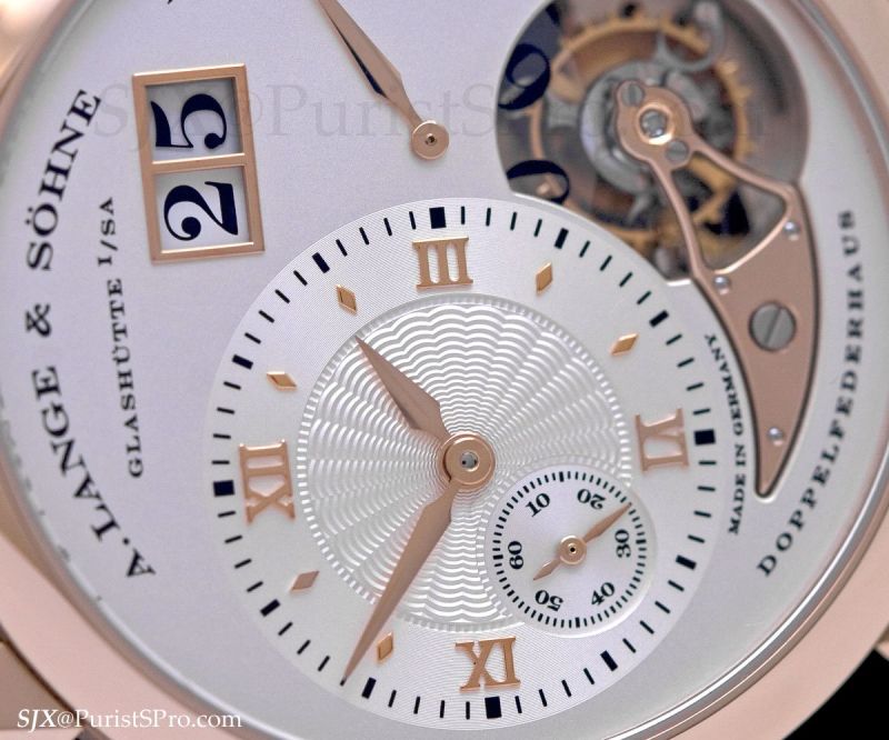 As a result of the larger cut-out on the dial, one of the discs for the big date is sapphire so as not to obstruct the tourbillon cage. The exposed sapphire disc gives the watch a mildly informal look which is atypical for Lange. 150 of these will be made.