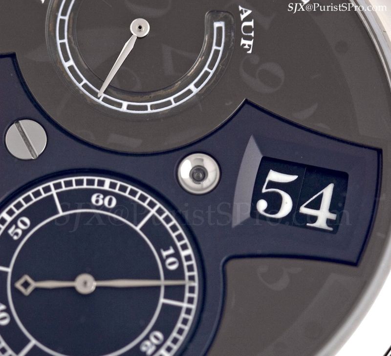 The Zeitwek Luminous watch is absolutely unconventional for the brand, it might even be considered avant-garde. This platinum Zeitwerk feature discs with luminous numbers and a translucent, grey-tinted sapphire dial. The dial allows the luminova numerals on the discs, not just in the window, to be charged during the day and reveals them at night. To complete the look, the German silver bridge on the dial is black PVD coated. During the day this has a dark, almost brooding look, but at night it glows tenaciously.