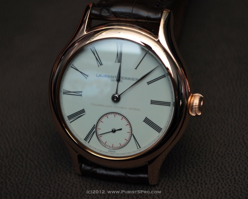 The Galet Classic with its double spiral tourbillon has new dial possibilities with applied gold roman numbers.