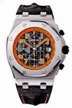 The Royal Oak Offshore Volcano Chronograph is crafted in stainless steel with rubber push pieces and crown. Distinctive to the Volcano are the orange numerals and inner flange. Black Hornback crocodile strap with orange stitch detail complete the look.