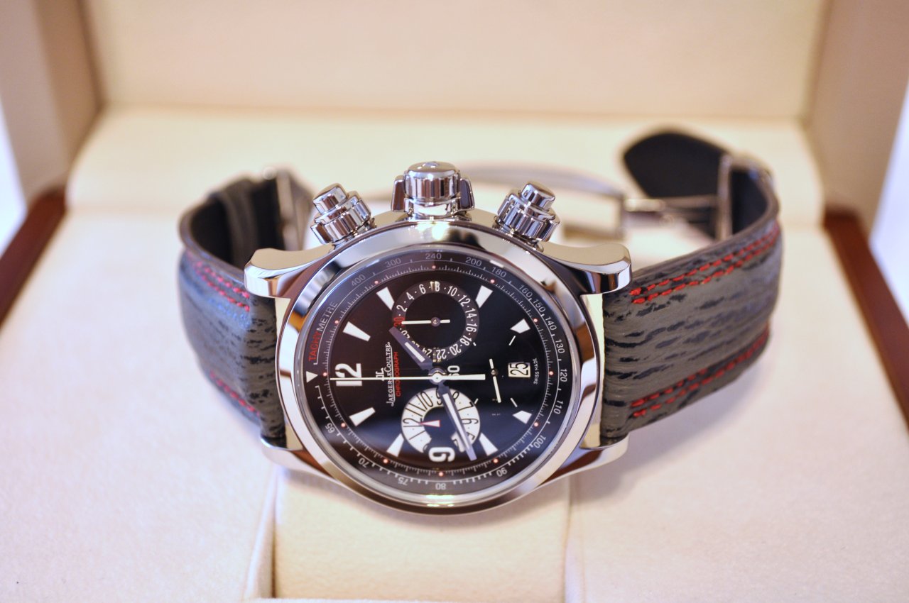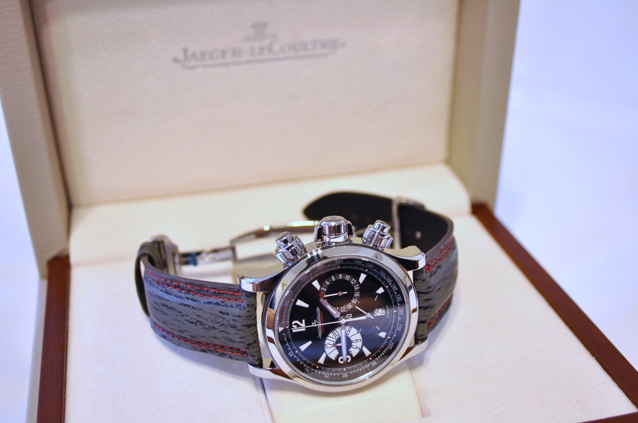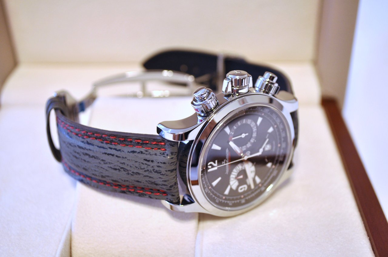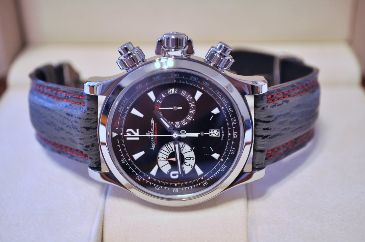 Just wanted to share with you my Master Compressor chronograph with a custom Jaeger LeCoultre sharkskin strap in athracite with double red stitching and rubber backing.  The combination just looks awesome.  The black specks on the strap blends really well with the watch's dial.  Got the strap from the JLC boutique in Beverly Hills courtesy of Mr. Seth Baert(he can hook you up with all your custom JLC strap needs).