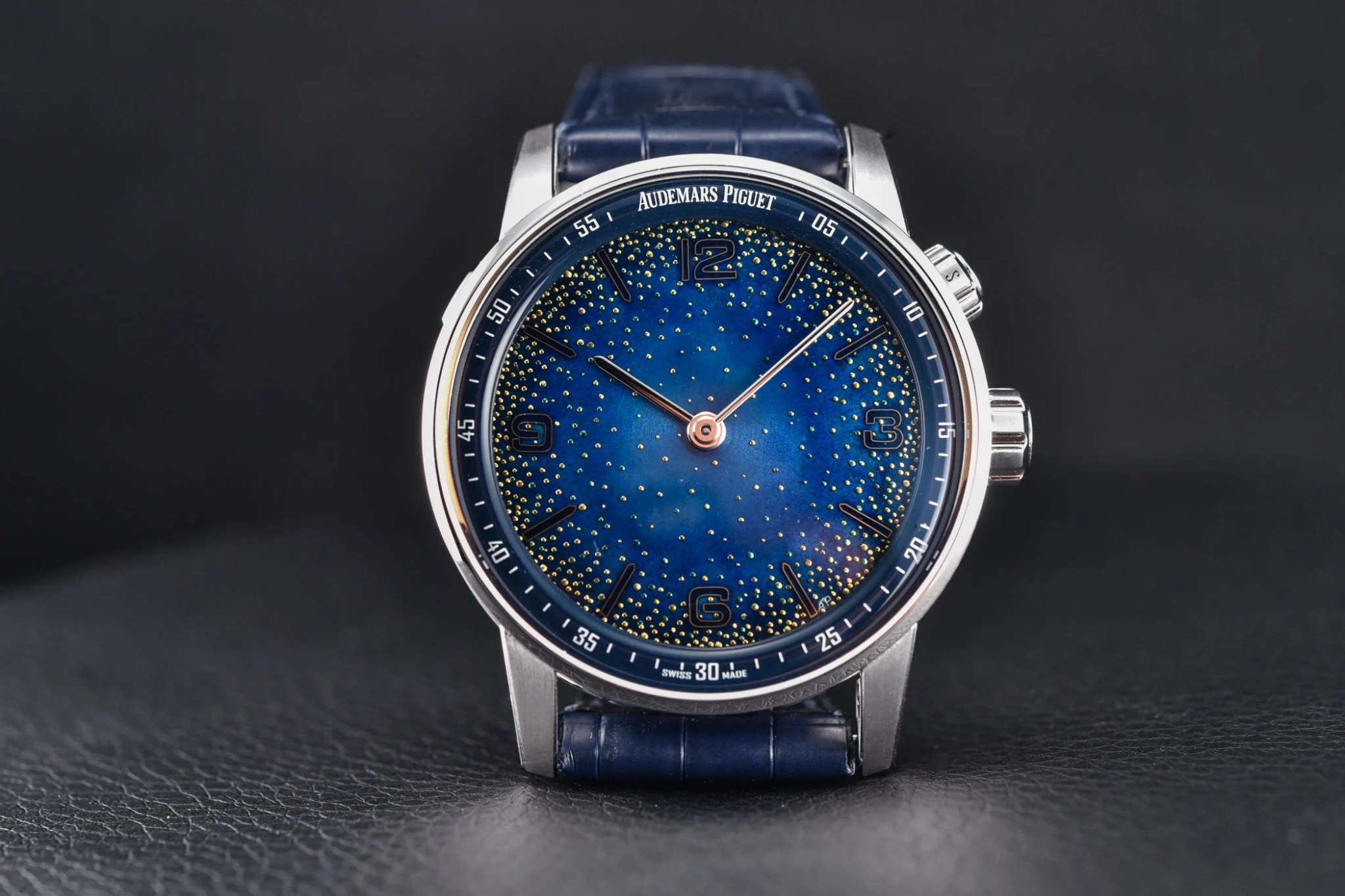 5/ FROM THE CODE 11.59 COLLECTION Grande sonnerie Carillon Supersonnerie ref. 26397BC.OO.D002CR.01 (5 unique bespoke Grand Feu enamel dials with antique gold spangles - handcrafted by Anita Porchet, white gold case)