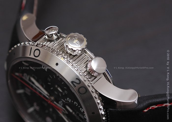 Alarm setting pushpiece at 4 o'clock sheathed in black