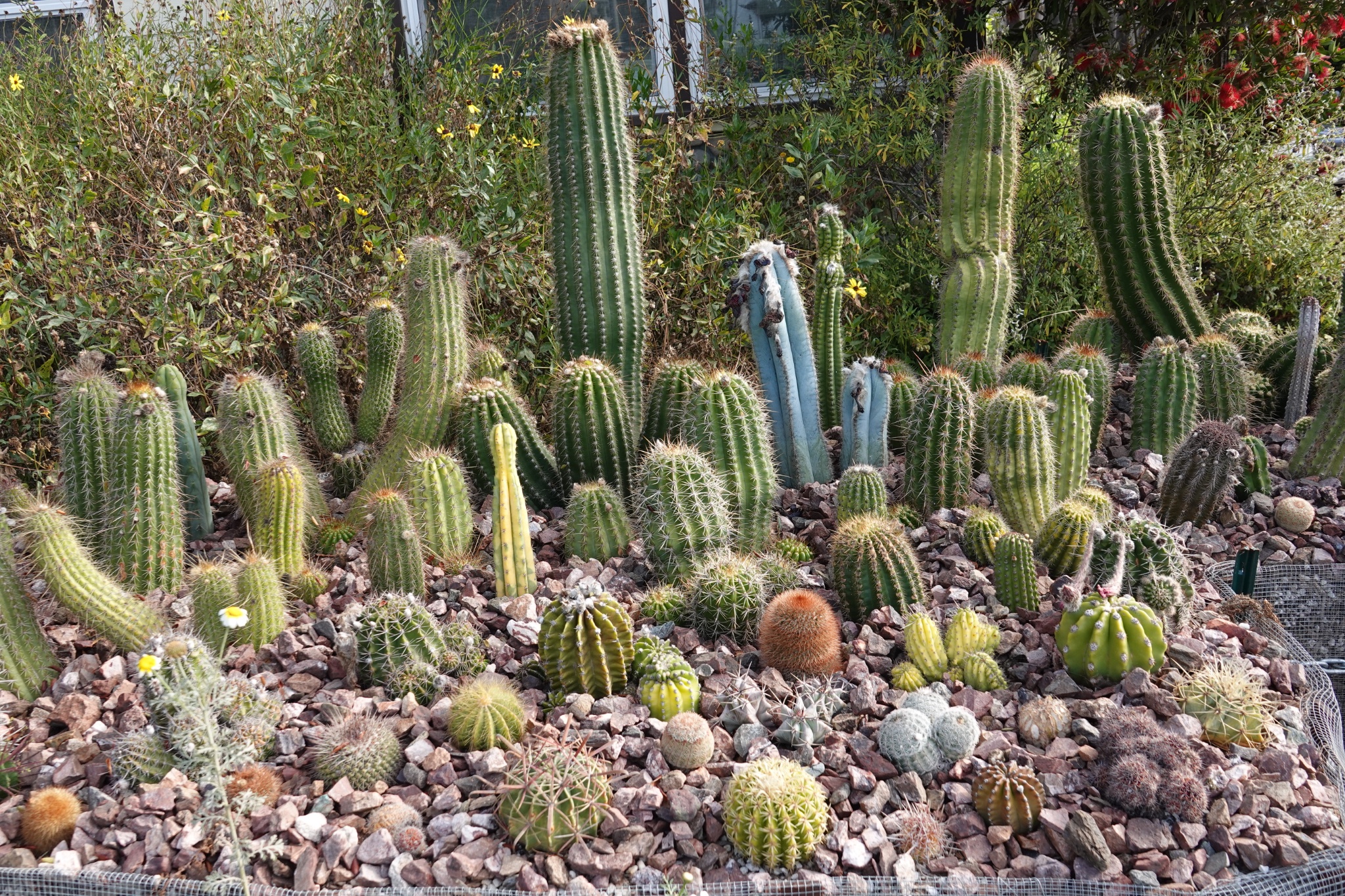 We are now in the garden with cactus and bottlebrush (far right). Huge metal screen “container” of gravel holds the soil in which these cactus grow. Maybe it’s concrete underneath, or someday they want to take the cactus away with them? A mystery. But we walk on without solving it.