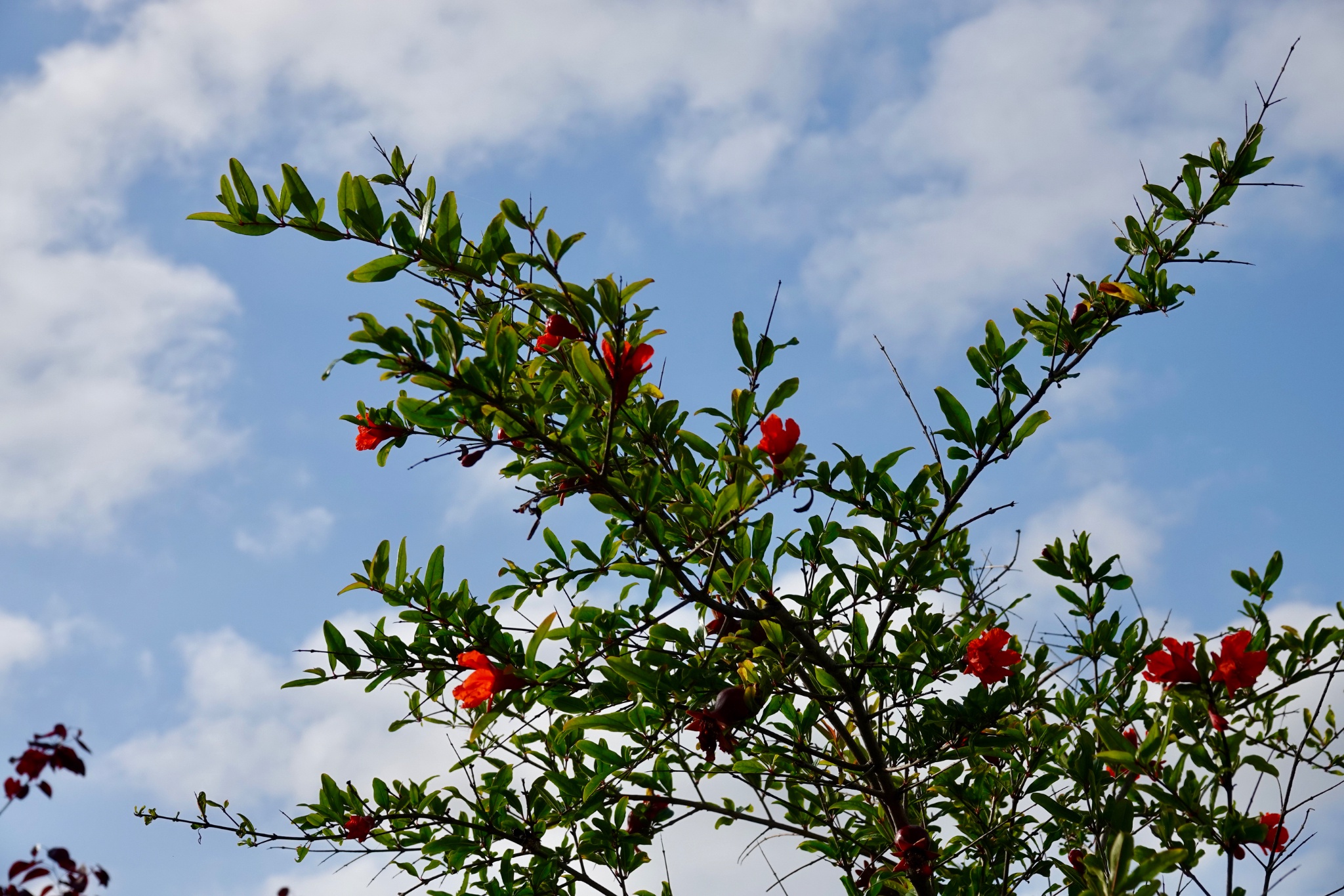 The skies are clearing a bit and we stepped under this Pomegranate tree. I wonder how ours are doing, down in our canyon. I must go take a look someday.