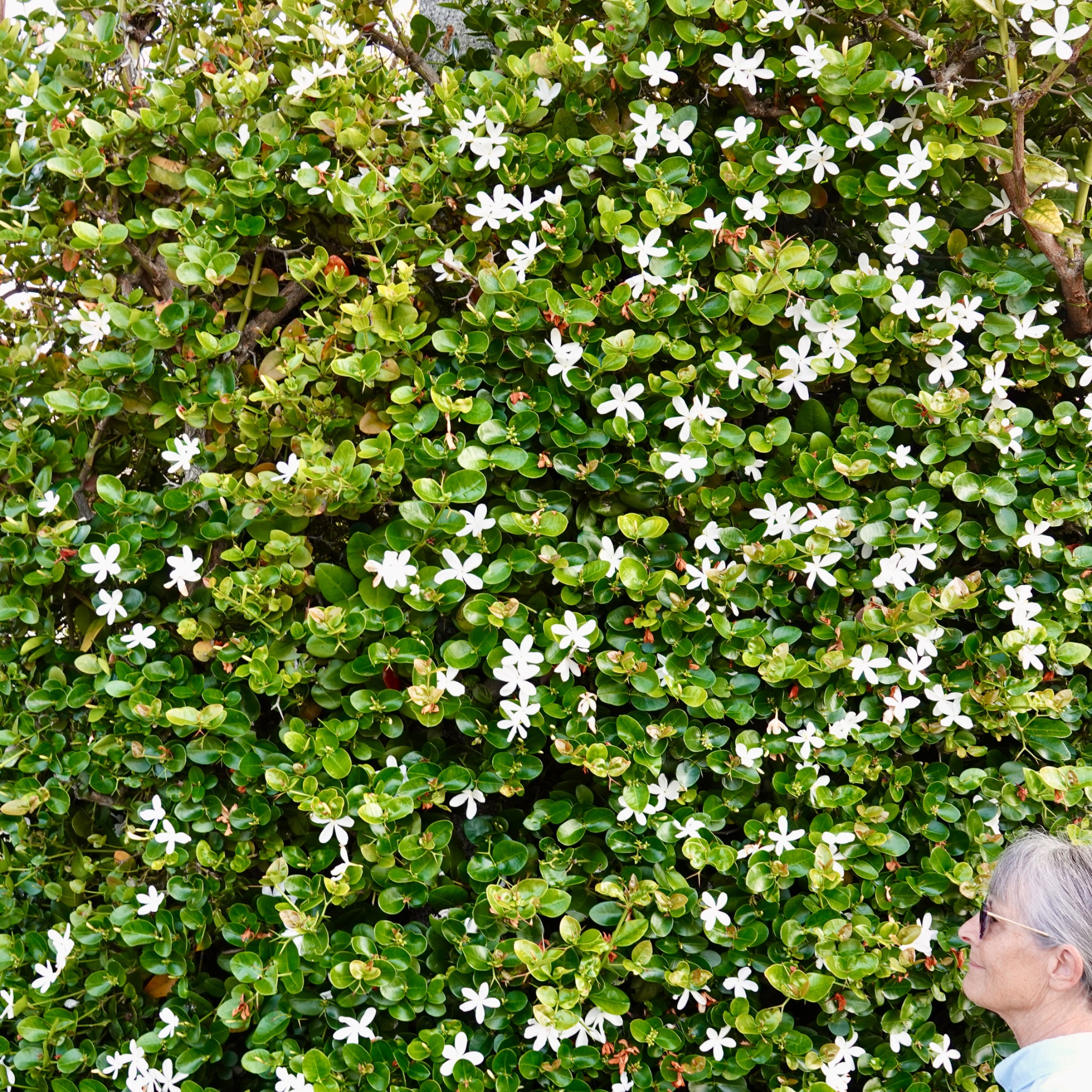 These flowers are so fragrant you are almost bowled over by the scent. Now if I can only remember what they are called! [Natal plum]