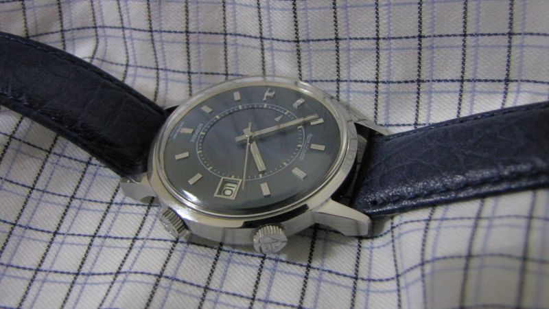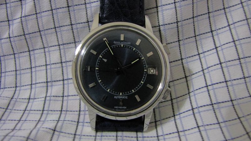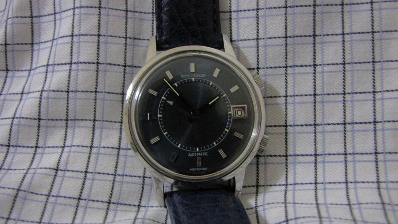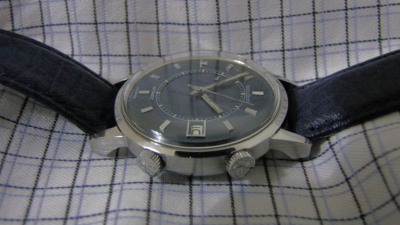 first, thanks must go to our great JLC moderator, Nicolas and our recent JLC new comer but who has in fact been with us long age, Blomman for their advice and input during the process of my hunting for this watch. as some of you may hear about this, i have been looking for vintage JLC for quite some time, in my hunting list, of course the best is to get a rare bird, i.e. Geomatic or Geophysics, but i am also interested to get Futurematic or Memovox. as long as they are in a good condition, I would be more than happy to get one. back to the story, this lovely Memovox came out of my intention. it was started when i was hanging around a flea market here just last Sunday. of course, i went to my favorite stalls that selling vintage watches. in fact most of the time, i was disappointed by all these stalls because conditions of vintage watches selling in these stalls are generally poor, hardly find a good looking one, some worse ones are even refinished or redone which can't reach to our vintage watch collector's standard. however, this time it made my past impression changed because i saw a very good looking JLC Memovox with a date function and most eye-catching thing to me is that the dial of this Memovox having beautiful blue color dial which to my knowledge - this blue color is relatively rare. this watch is in very good condition, it seems the owner wore it not very often. at the end, i just asked the price of the watch from the stall keeper and asked the telephone number for future contact because i need more information from other experts before putting my bit on my vintage JLC, although i have accumulated some experience of collecting vintage Omega. day after Sunday, I called and met the seller at one watch maker shop and asked to open the caseback to see how the movement looks like. to my surprise, i saw a shinny movement in my eyes. i also found "Jaeger LeCoultre" signed on the rotor together with "...adjusted...positions" engraved. then i further found there was a "916" engraved on the edge of the calibre. That movement, just felt too happy to see that because i remember i read this model number somewhere likely from the best reference book for JLC vintage collection published by Zaf. then i shake the watch, the rotor can freely rotate in 360 degrees which further matched with this calibre (i.e. K916). but one thing i am still not sure whether the case number and calibre serial number are correctly matched and also another thing i am also not too sure is that i saw "LeCoultre" instead of "Jeager LeCoultre" engraved on inside caseback. then i went back home to PM Nico and Blomman for some confirmation some of these observations from the watch. such fast, two days after Sunday I first spotted this vintage, i decided to buy it and bring him back to my collection. now, i just took some pics of this new comer to my collection to share with my friends here. before showing you the pics, some information regarding this watch is listed here for your information. 1. case diameter: 37mm 2. calibre number: K916 3. case number: E875 4. jewels: 17 5. barrels: 2 6. year of released of this watch (based on the serial number on the movement): 2,1xx,xxx (which means after 1970) 7. date window at 3 O'clock 8. "JL" logo at 9 O'clock 9. Frequency of calibre: 28,800 (also known as 'speed beat') 10. both crown signed with "JL" hope to you also join me to welcome this lovely Memovox to my collection as well as to this Forum. stefan