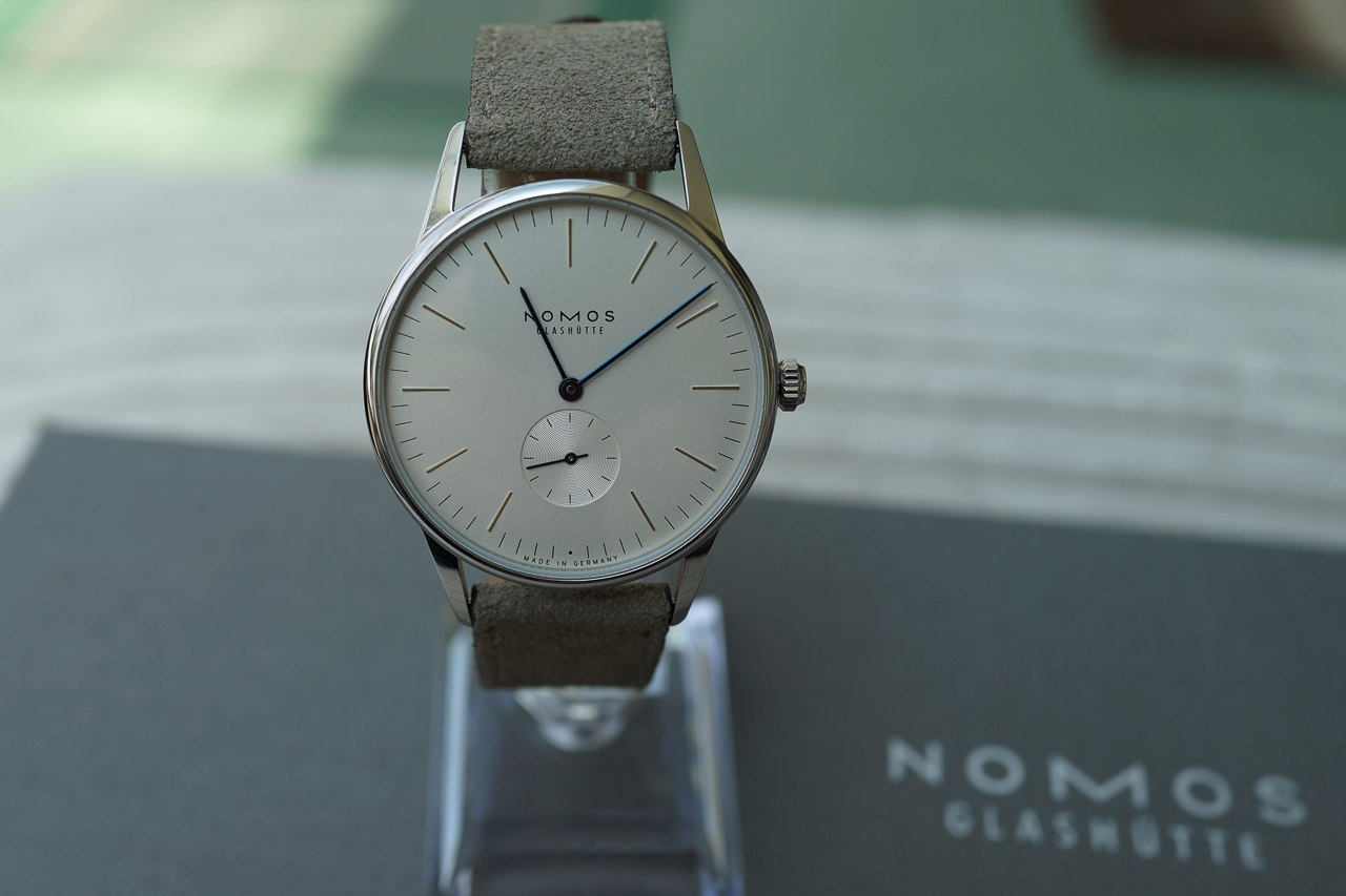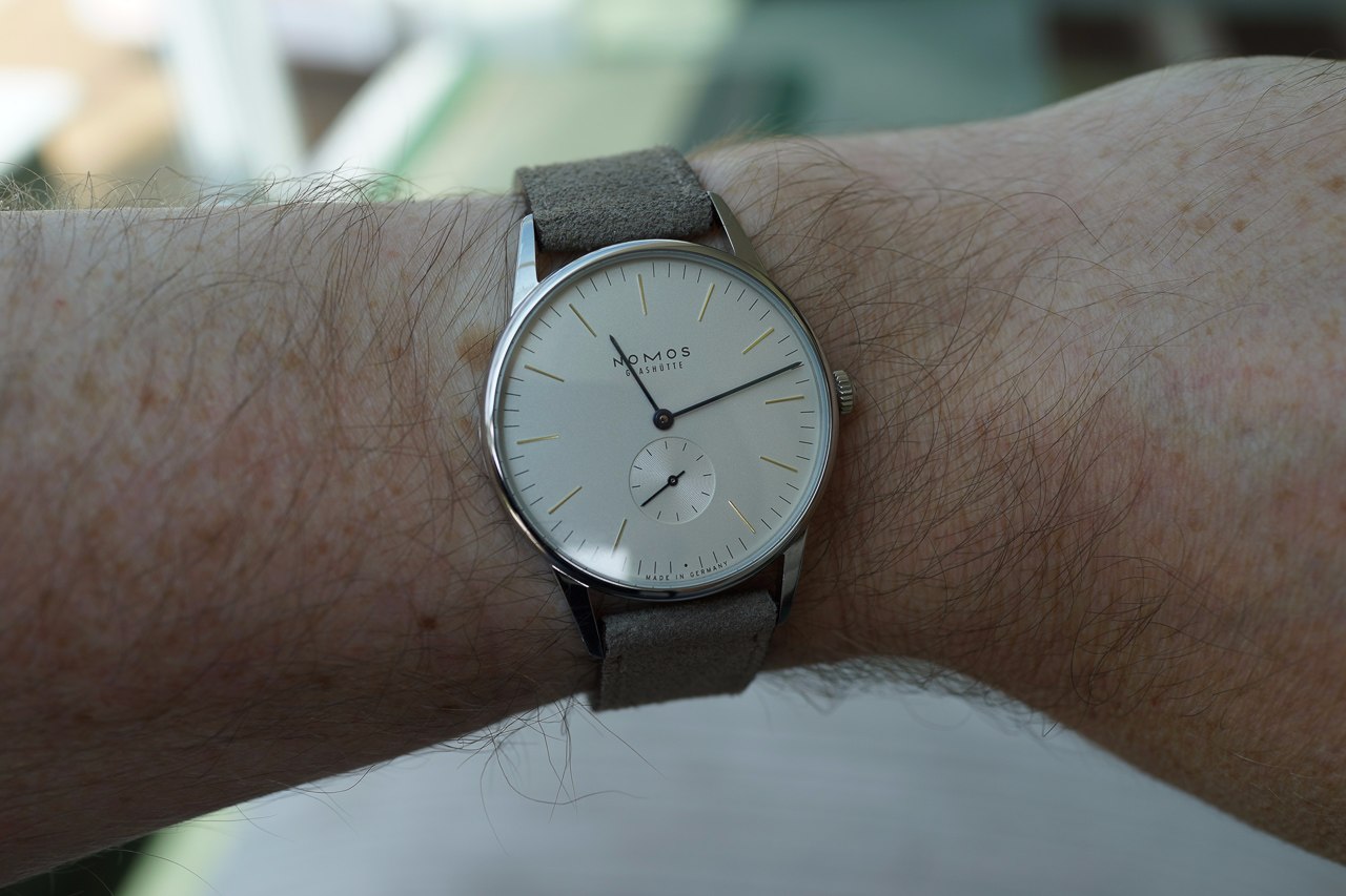 My first Nomos, which I'm delighted with - amazing quality and value in my opinion. I use it as my dress watch on the provided black Horween strap, but I also dress it down using the lighter velour strap shown in the pictures. I was a bit worried 38mm would be too large as a dress watch, but I think I get away with it on my 7.25 inch wrist.