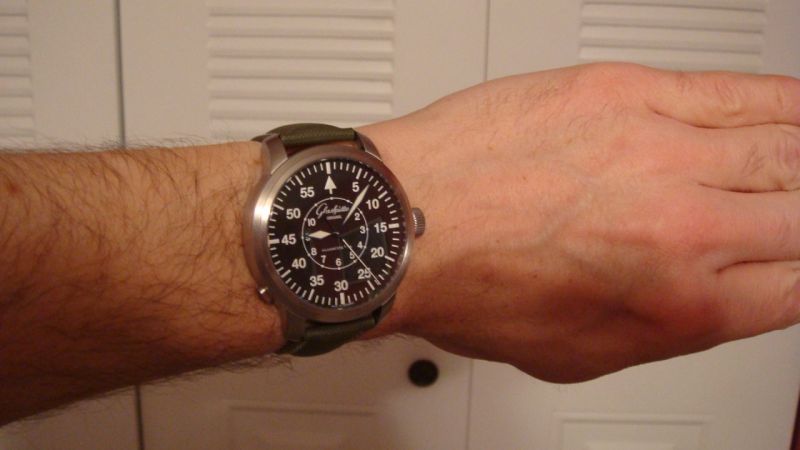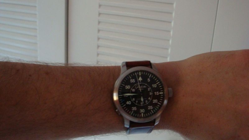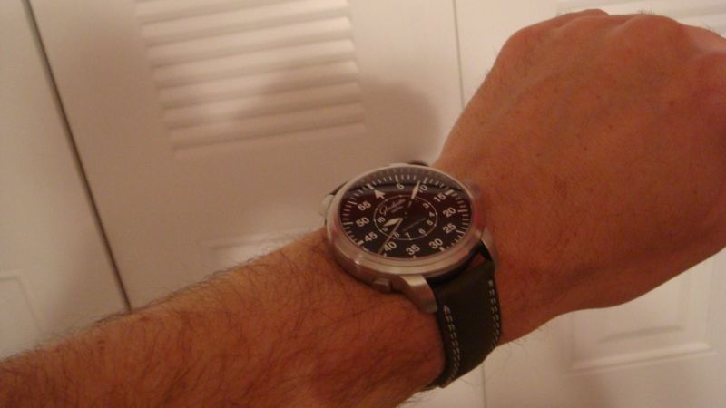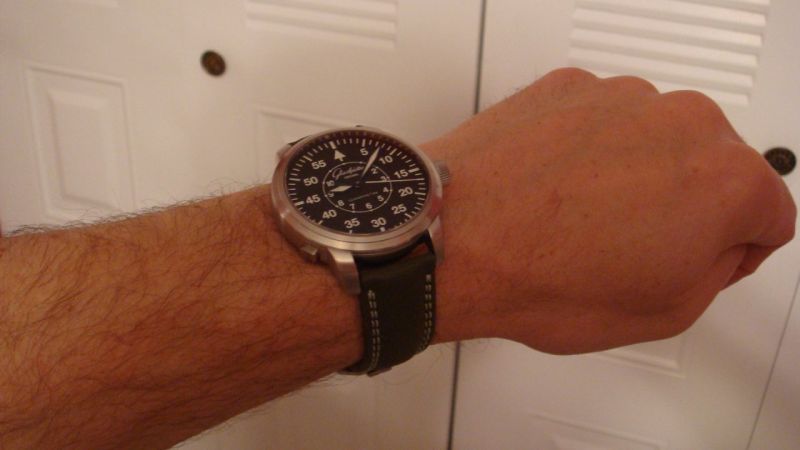 Yes, it's a big watch. In fact I think it's a HUGE watch for me, but it's a pilot's watch right? It's supposed to be big....and the way the lugs slope downward make it easier to wear on my seven inch wrist I think. The lume is really amazing and I wish I could take good pics of it at night but so far haven't been able to. This watch has a great feel which is very different from the Sport Evo and the Sixties of course. While big, it's light but with a solid weight to it, and while big, really doesn't have a big presence. Tough to describe, it's just a COOL watch in my opinion. I like the strap it came with, it's very high quality leather and gives a real vintage look and feel, but for changing things up, the Trieste strap works well I think: