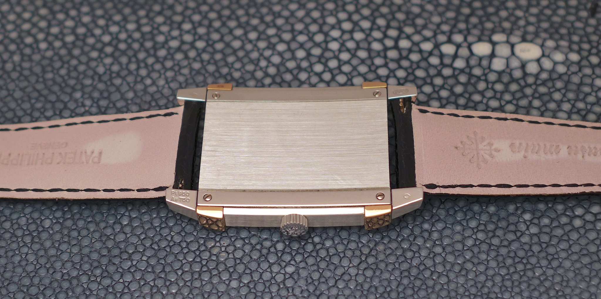 As the title suggests it, the case is a blend of platinum and rose gold. The size is 48 x 33 mm, and it houses the famous Cal 215PS.