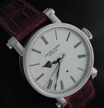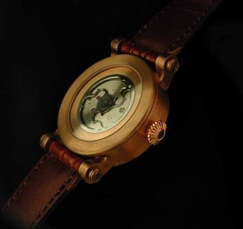 "the pieces are protos, the final quality of finish will be supperior to that shown here, I have replaced the automatic mechanism with one matching my tourbillon in style, hand beveled wheel on a german silver bridge. The white version with gold crown will be a white gold case, the white crown white case will be platinum..."