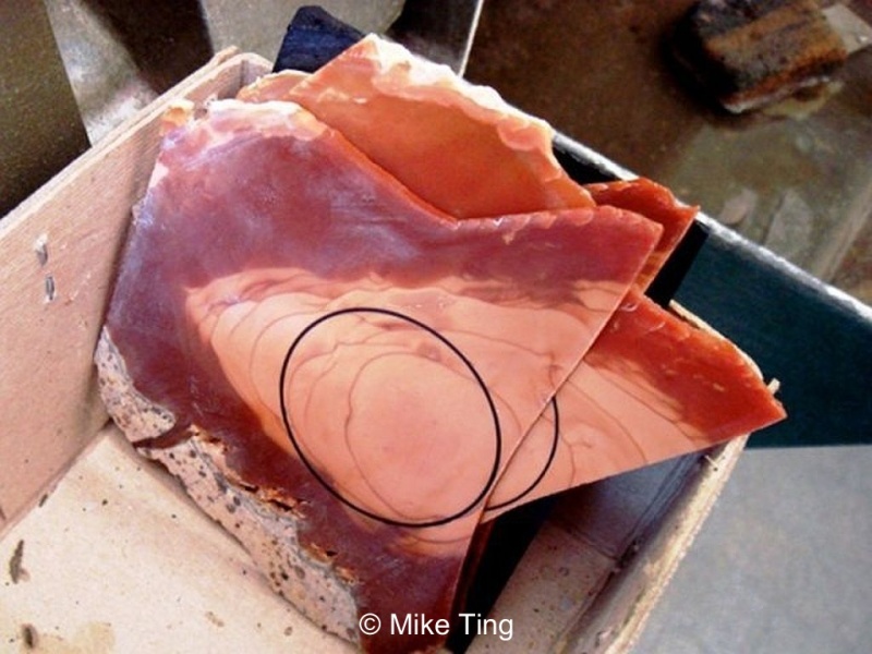 The first step is sawing through the rough rock sample. Ideally rough material should have good colour/pattern, uniform texture, freedom from large fractures, stains or unwanted inclusions.