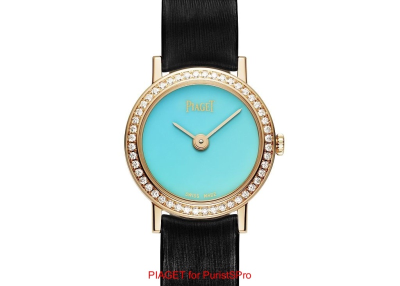 18K pink gold case set with 48 brilliant-cut diamonds (approx. 0.4 ct). Turquoise dial, Piaget 690P quartz movement, black satin strap.