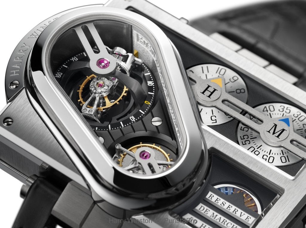 The fluid outlines of the tourbillon housing in polished white gold contrast sharply with the rectangular rigidity of the lower case displaying the indications. Even the Harry Winston triplearch motifs on the lugs have been squared off. Lustrous finishes — surfaces brushed to a silky texture, gleaming chamfers and the matt battleship grey of the Zalium® — set off the bold outlines of this extraordinary architecture.