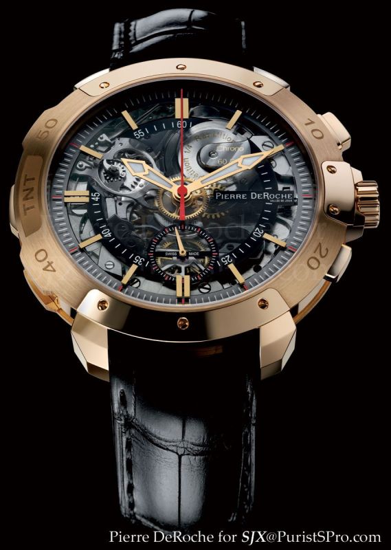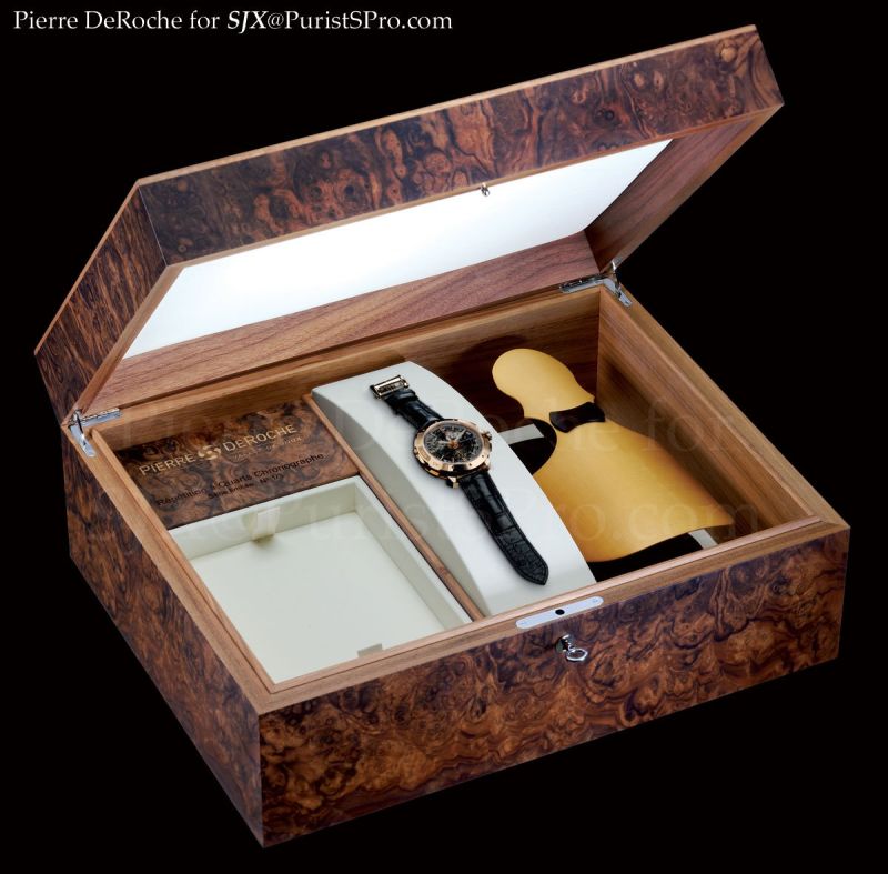 Pierre DeRoche merges 19th century hand-crafted know-how with 21st century technologies in three exceptional watches. Authentic 19th century LeCoultre hour & quarter repeater and chronograph pocket-watch movements, modified by Numa Robert-Waelti in around 1894, have finally found the case, dial and hands they deserve in order to set them off to their best advantage.