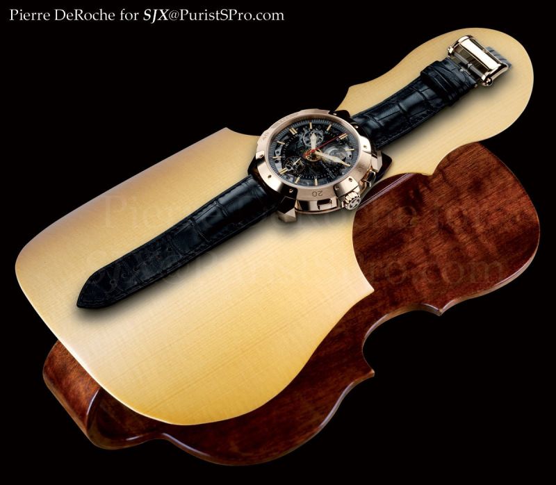 A luthier known for his magnificent guitars was entrusted with creating a resonance instrument. Based on the same principle as violin or guitar soundboards, he created a base made from the wood of spruce trees from the Vallée de Joux. The sound of the repeater strike is thus magnified when the watch is placed on this base.