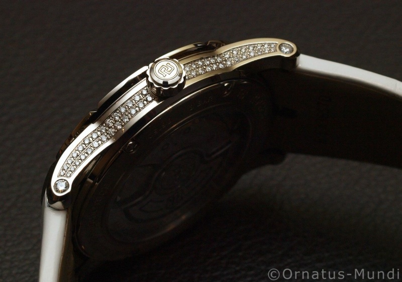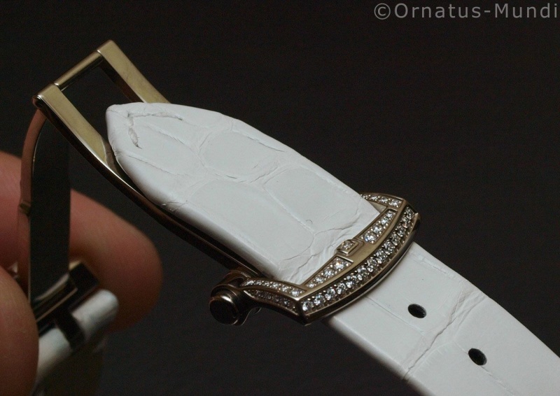 The deployant clasp is also made of white gold and - just like the case - covered with diamonds. Even the pin is adorned by its own scintillating light: