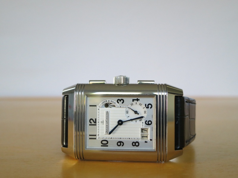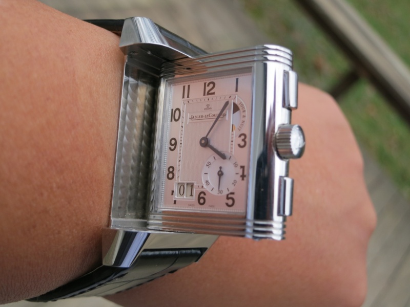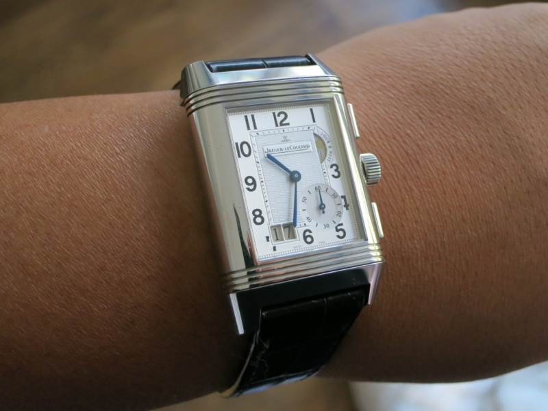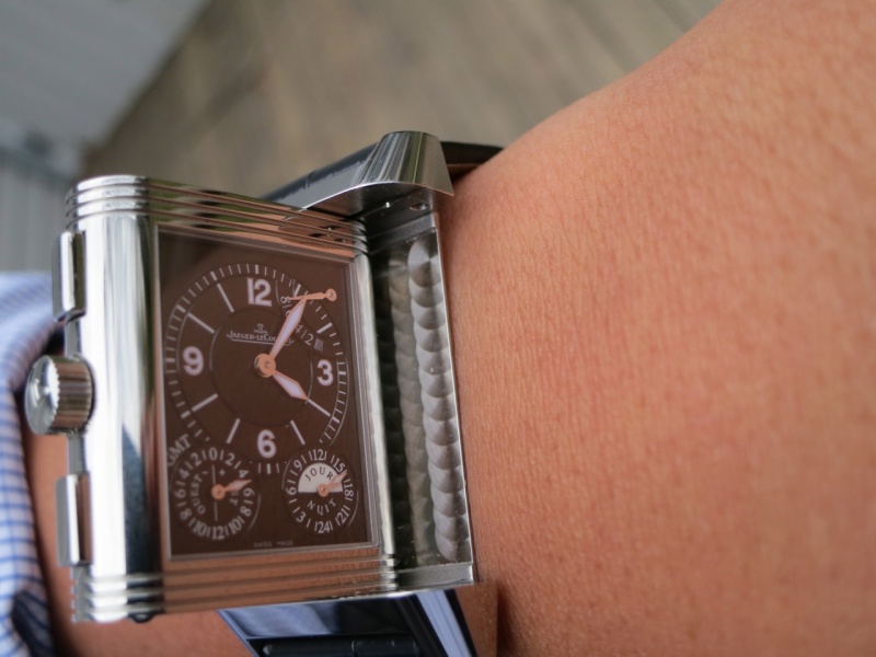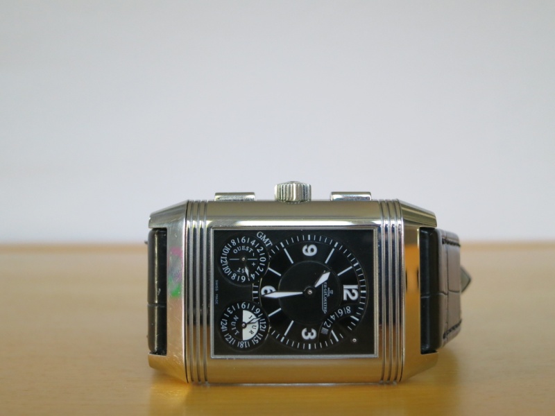 Worked with the amazing JLC team in Beverly Hills & NYC to get the last of the Reverso Grande GMT's on my wrist. Took approx. 6 months to locate one but was worth the wait. I like the new UT's but this classic exudes both elegance and a sporty look and as most say, it's like having two timepieces at once. I originally purchased the 976 but it was too big for my wrist and if I am spending this type of money, I'd rather spend a bit more and have the timepiece I really coveted. The 8 day power reserve, large date, day/night indicator, seconds and gmt function make up the complications. I'd rather have seen the power reserve indicator on the "home" side like the Grande Moon/Date, but no complaints.