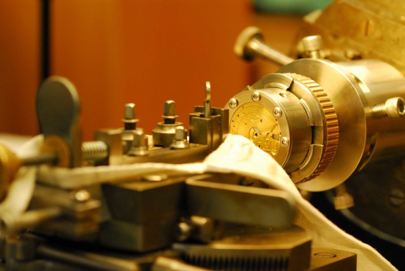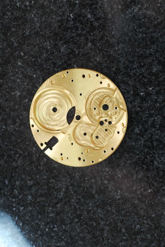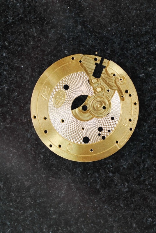My next call was to Roland and his chief designer, Richard Baugh, to ask if I could keep the basic design with the same engine turning on the dial and the same cotes de Geneve, anglage, and perlage on the movement viewed through the case back. But I wanted higher contrast and asked to have the interior portion of the dial in gold, not rhodium, and the reverse of the movement in both rhodium but primarily gold. I then asked for a gold keystone crown instead of stainless steel and although Roland had never done that before, he relented, and the crown is now 14k solid gold with a keystone insignia. For those of you who are not familiar with the keystone that is a state symbol of Pennsylvania! I then asked for serial number, 052, as my other custom watches have the same serial number. It is my birth year.