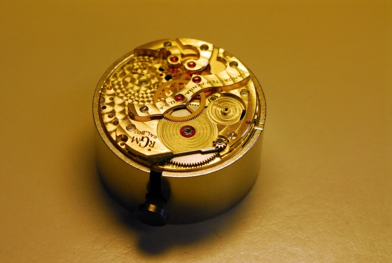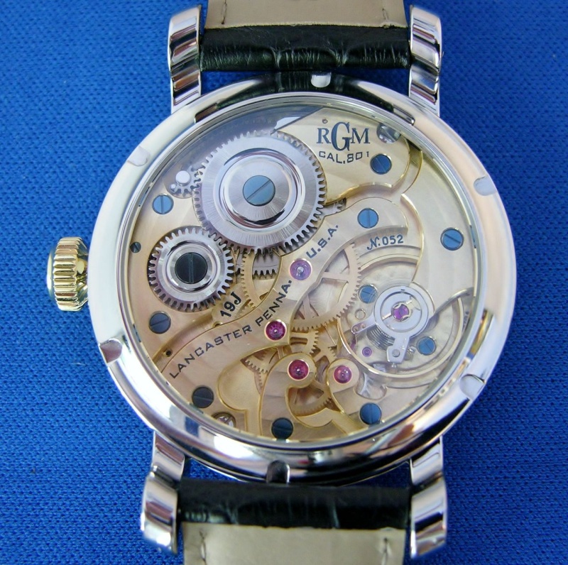 The caliber is RGM's American made caliber 801 (the address of RGM is 801 Main Street). The caliber has 19 jewels, 18,000 vph, rhodium and gold finished in Circular Cote de Geneve, perlage and anglage. It has a special 7 tooth winding click. I may add after the watch's shear beauty the one surprise I experienced was the ease and smoothness of the winding....truly as good as I have experienced on any watch I own or have wound.