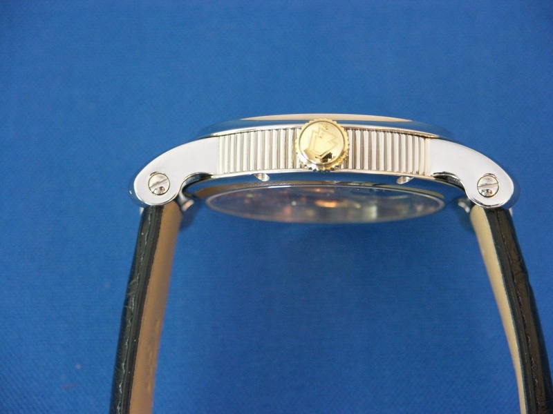 This is Model #PS 801 ES. The dial is rose engine turned and partially skeletonized with Roman numeral indices. The hands denote hours, minutes, and sub seconds and are brequet style blued steel. The crown is 14k solid gold with a keystone insignia. The strap is black alligator with a signed RGM stainless steel buckle (I have another brown alligator strap on order).