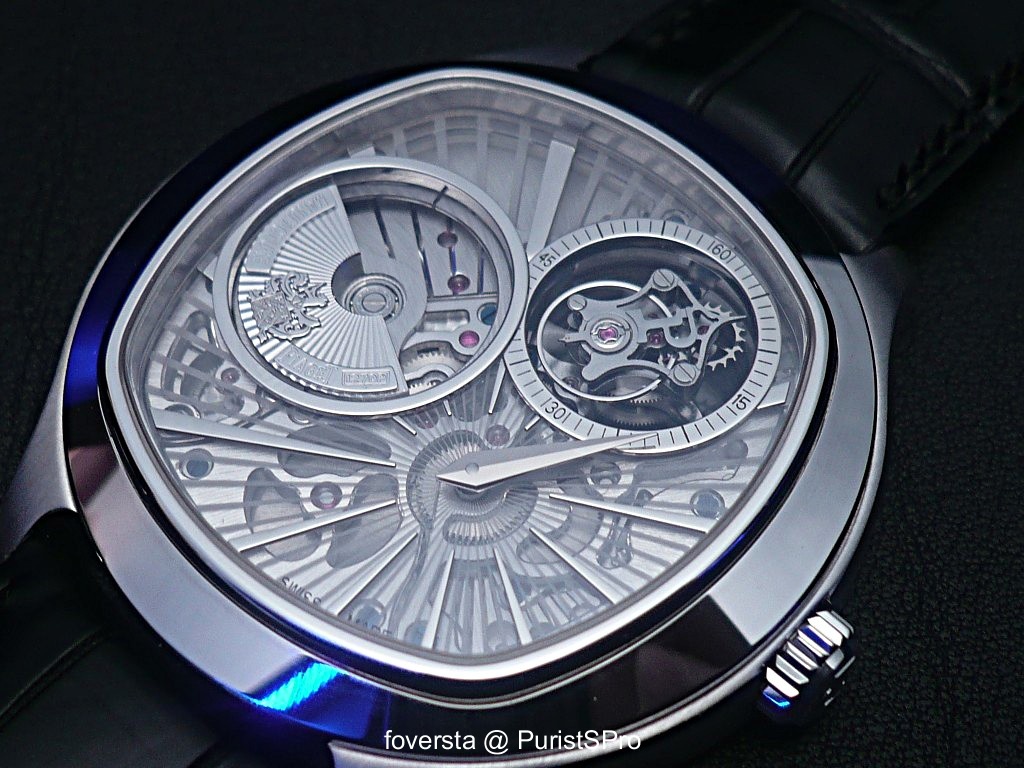 The cushion shape case works quite well in this context and I really like the sunrays decorations on the dial and the transparency. But I'm less convinced by the rotor dial side. It spoils a bit the beauty of this timepiece. Anyway, this Ultra-Thin Tourbillon is a great watch. The 46,5mm case is at the end not too large (I had the same feeling with the Emperador Moonphase). Maybe I would have prefered to get the power reserve indicator dial side in place of the rotor...