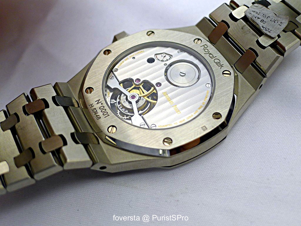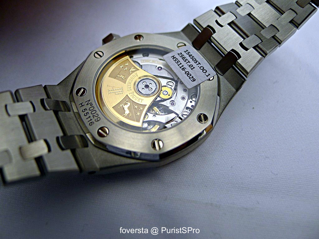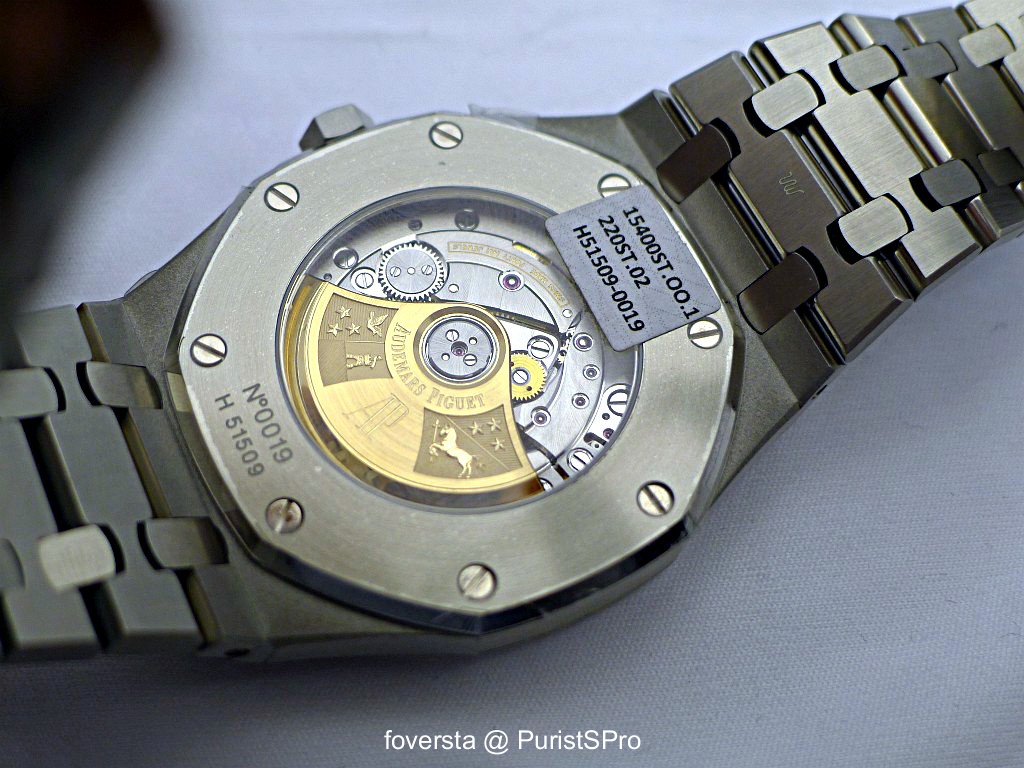 During several years, the 15300 and its in-house 3120 caliber was considered as the best way to enter AP world. I was not a huge fan of this one because one of the key assets of the Jumbo was its slenderness and for me, the diameter/height ratio of the 15300 was a bit too far from the original concept. AP has tried with the 15400 to change this with a larger diameter. With its 41mm, the watch looks much bigger than the 39mm of the 15300 but remains quite well balanced on a overall basis. But carefull: due to the shape of the bracelet, the watch is not dedicated to small wrists. When we turn over the watch, 3120 caliber seems to be a bit lost in the case. Again, these 2mm are far from being without any influence. The diameter/height ratio is better for my taste but I found the watch a bit too bulky. Actually, the Jumbo is always in my mind and I'm still facing the same trouble: for me, there is absolutely no need of a second hand on a Royal Oak. But the 15400 wil make very happy the larger wrists and the people who look for a more powerful design than a very refined one.