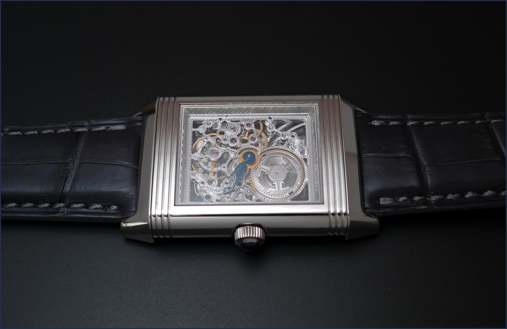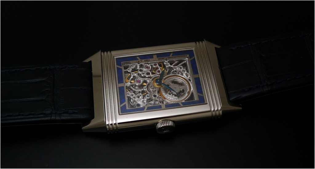 As the skeleted movement is not only a movement, but a whole part of the watch, and also a dial, JLC framed it with some blue enamel, which matches with the heated blue hands, for a superb outcome.