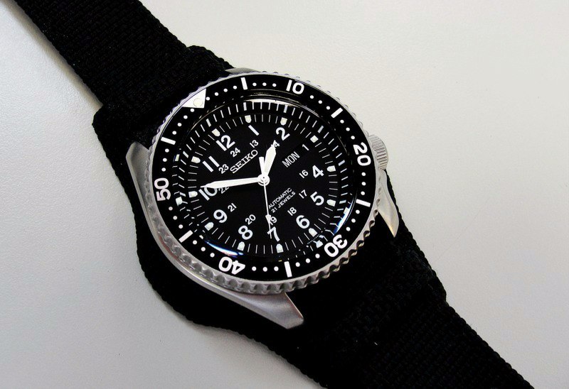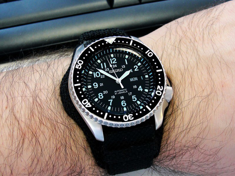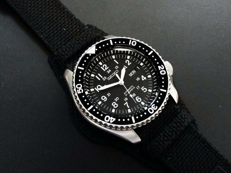 Black PVD bezel insert with white numbers, sandblasted case and SNX427 dial and hands. The strap is black nylon from the Atlas. Cheers, Adriano