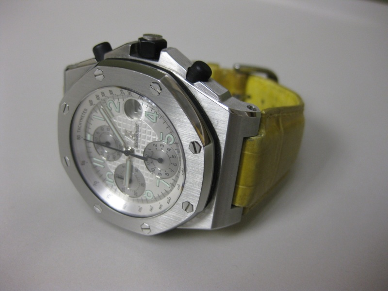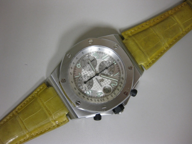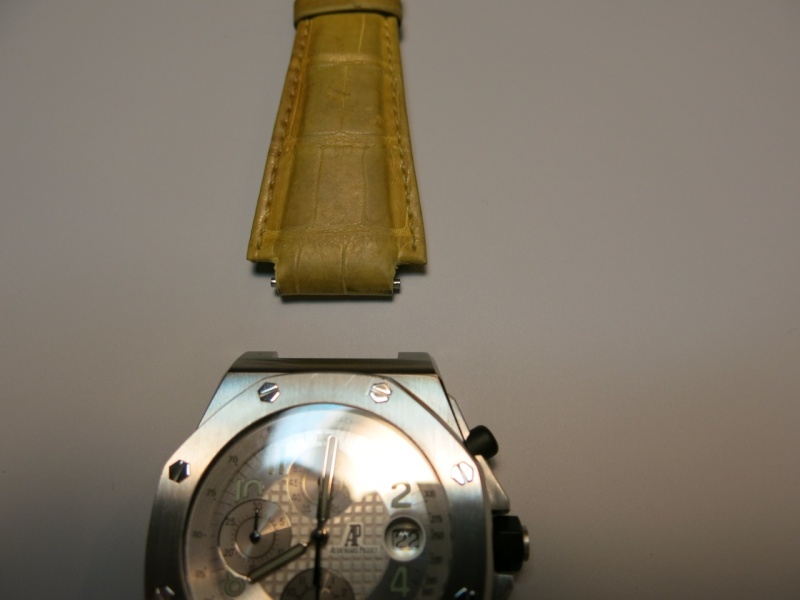 I decided to try an old strap on my silver dial 25770 Offshore that I had not mounted before. The strap was used and came with one of my very first 25770 acquisitions. Based on when I bought the watch, the strap is likely 8 years old +/-. It is an original Audemars Piguet gator strap in a mustard color.
