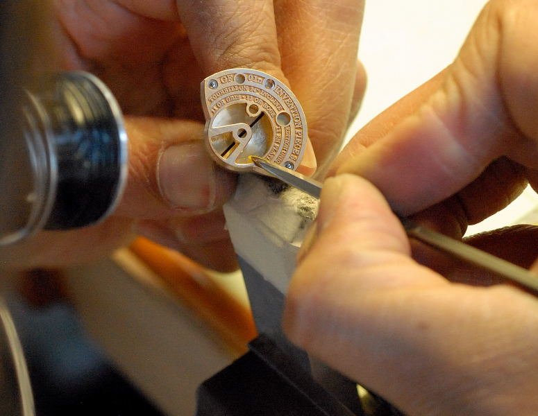 Finishing at Greubel Forsey applies a number of different techniques to different surfaces. Rather than use Geneva stripes, Greubel Forsey use a frosted finish on the plates. This is achieved by taking the nickel-silver plate metal and beating it with an electric powered metal brush. Once again, this cannot be undertaken in a simple mechanical way, there is a skill required in terms of the pressure to be applied to the plate from the brush.