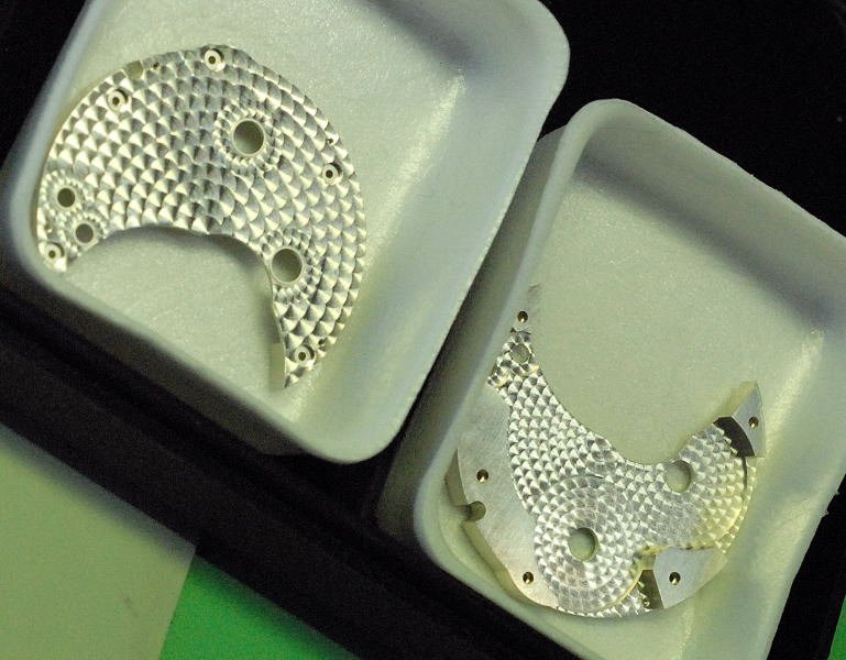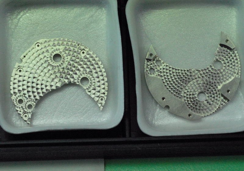 The plate starts off being machined with CNC. While the objective is always to end up with a smooth plate from the CNC machine, there is always the problem of a small metal bur or a slight inconsistency (steps) in the surface of the plate. The sort of ‘steps’ they are looking for here is approximately 2 microns in height. To spot such small errors, the raw piece is then bead blasted with glass beads to check for defects. The difference that is Greubel Forsey is that this is not the industrial type of blasting that is undertaken to remove defects and to promote the final finish; this is a blasting that will show defects, and if the defects are found, the plate is rejected. The finish that is left on the plates (providing they are not rejected) is a smooth surface finish. Hand perlage polishing is then applied to ensure that the surface is an exacting ‘mate’ to the adjacent surface and to culminate the matt blasting finish.