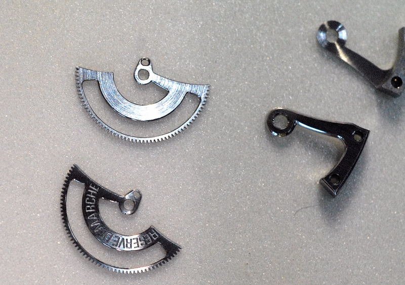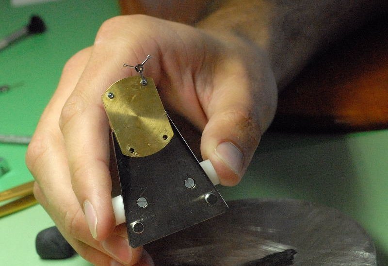 The progression from the raw bridge, to the finished bridge is approximately 30 hours of polishing and anglage; even on the inside surfaces. Looking at the plates at different stages of finish, it is possible to see how the small changes to the surface and edges occur to result in the final plate that will be screwed onto the top of the nickel silver plate shown above.