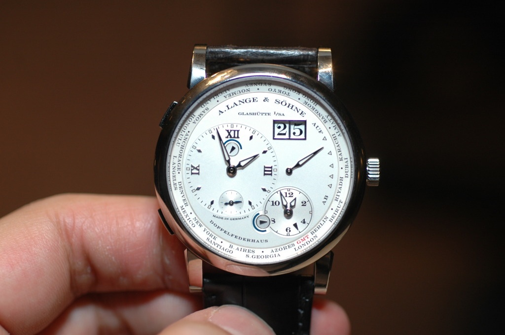 Lange 1 Timezone with luminous hands, giving it a dress-casual look.