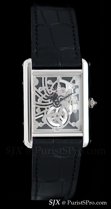 This was a piece unique made for the Cartier Collection. Unusually the bridges of the skeleton movement are coated with Luminova, though the hands are not.